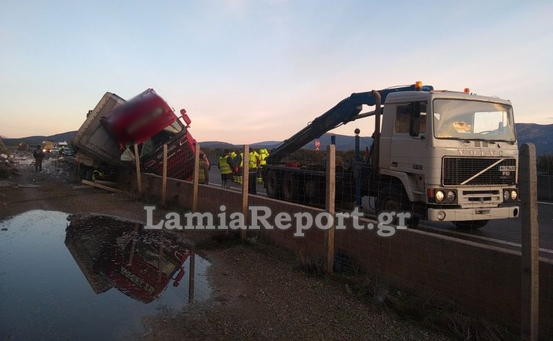 Η εκτροπή της νταλίκας έγινε στο 99χλμ της Αθηνών - Λαμίας, στις στροφές της Υλίκης, στο ρεύμα προς Αθήνα.