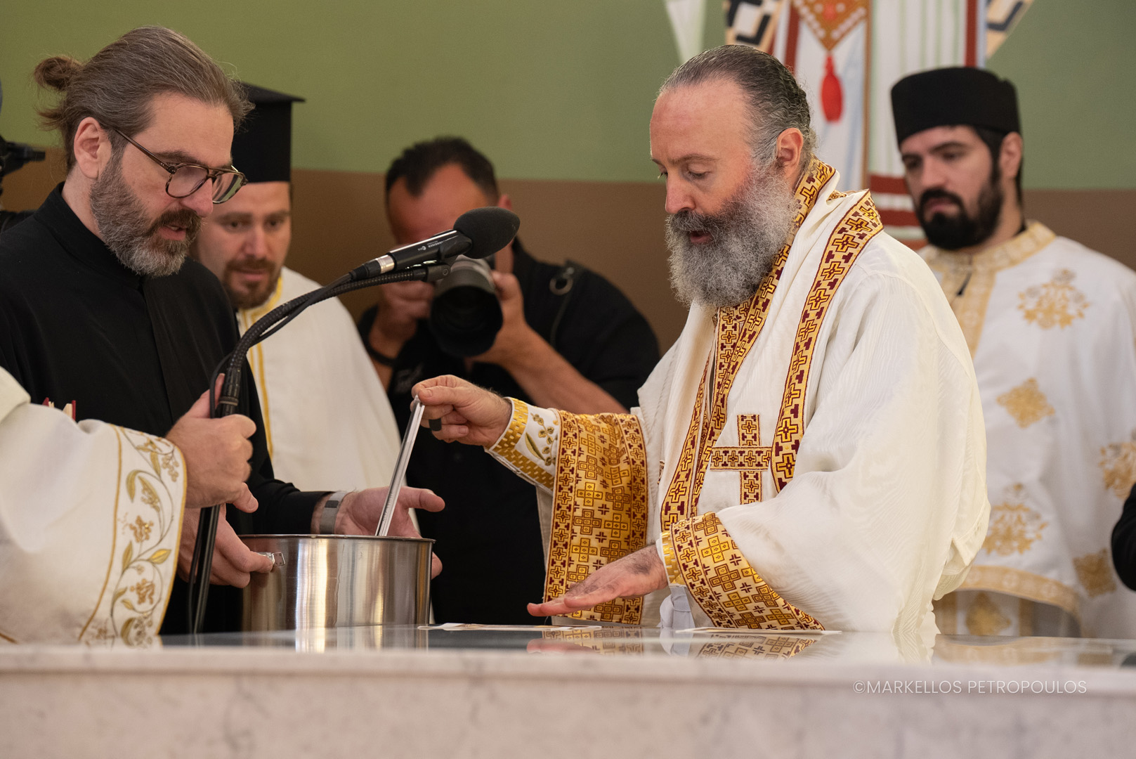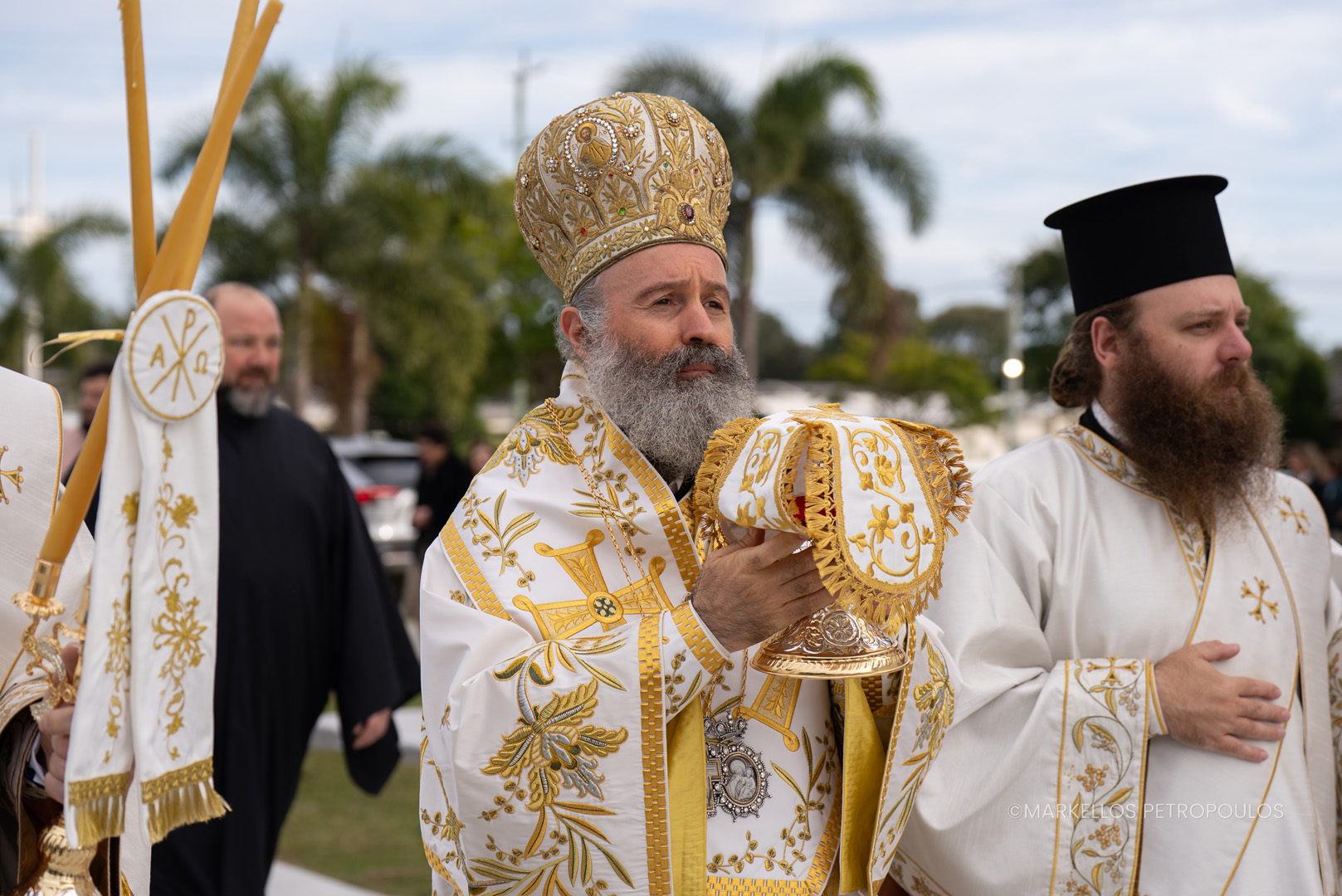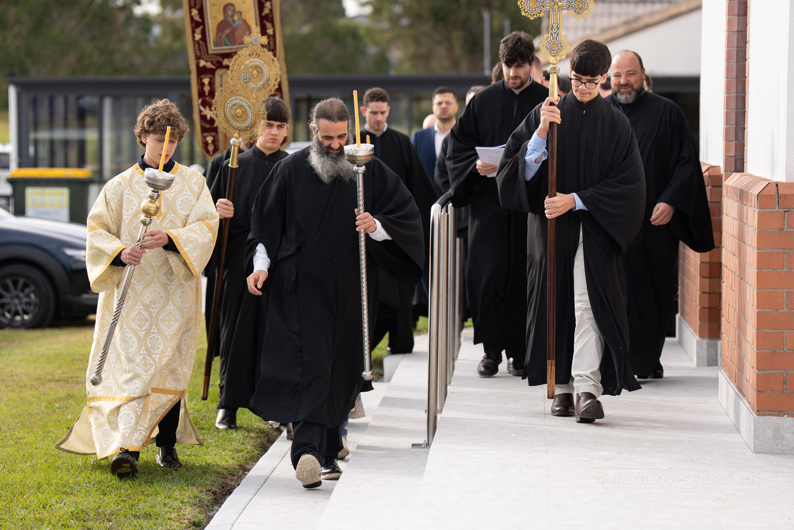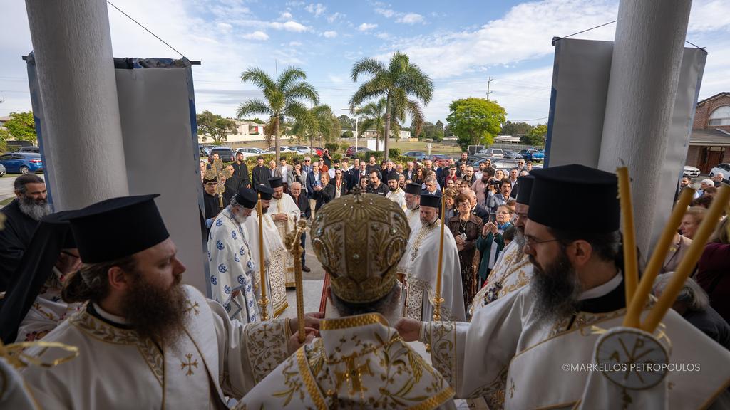 Όπως ορίζει το Τυπικό της Εκκλησίας μας, μετά το πέρας του Όρθρου, ανεγνώσθησαν καθαγιαστικές ευχές και ακολούθησε η λιτάνευση των ιερών λειψάνων τρεις φορές πέριξ του Ναού, με επικεφαλής τον Σεβασμιώτατο. Με την προσταγή «Ἄρατε πύλας, οἱ ἄρχοντες ὑμῶν, καὶ ἐπάρθητε, πύλαι αἰώνιοι, καὶ εἰσελεύσεται ὁ Βασιλεὺς τῆς δόξης» (Ψαλμός 23. Ψαλμὸς τῷ Δαυΐδ· τῆς μιᾶς Σαββάτων), άνοιξαν οι θύρες του Ι. Ναού και έγινε η θριαμβευτική είσοδος των Αρχιερέων, του Κλήρου και του Λαού, για να ακολουθήσει η τοποθέτηση των ιερών λειψάνων στο κέντρο της Αγίας Τραπέζης, στο «φυτόν». Ο Αρχιεπίσκοπος, αφού σφράγισε το «φυτόν», ανέγνωσε γονατιστός ειδική ευχή, δεόμενος για την κάθοδο του Παναγίου Πνεύματος και τον καθαγιασμό του Ι. Ναού. Έπειτα, έγινε η έκπλυση και το μύρωμα της Αγίας Τραπέζης, ο καθαγιασμός των αντιμηνσίων και, στο τέλος, η ένδυση και ο ευπρεπισμός της Αγίας Τραπέζης. Προ του πέρατος της Ακολουθίας, στους τοίχους του Ι. Ναού σχηματίστηκε με Άγιο Μύρο το μονόγραμμα του Χριστού και ο Αρχιεπίσκοπος άναψε την ακοίμητη κανδήλα της Αγίας Τραπέζης. Με βαθειά ευλάβεια παρακολουθούσαν τα τελούμενα οι εκατοντάδες πιστοί που είχαν κατακλύσει τον πανηγυρίζοντα Ι. Ναό, καθώς κατανυκτικοί ύμνοι εψάλλοντο από νέους της Χριστιανικής Ενώσεως του Σύδνεϋ.
