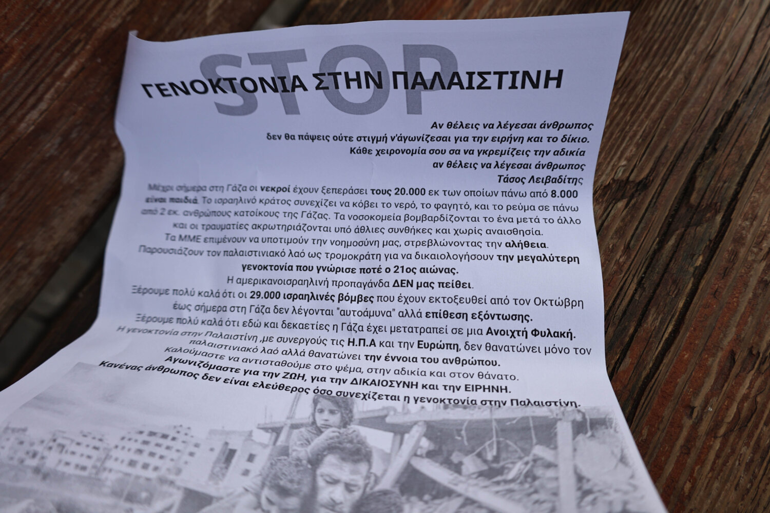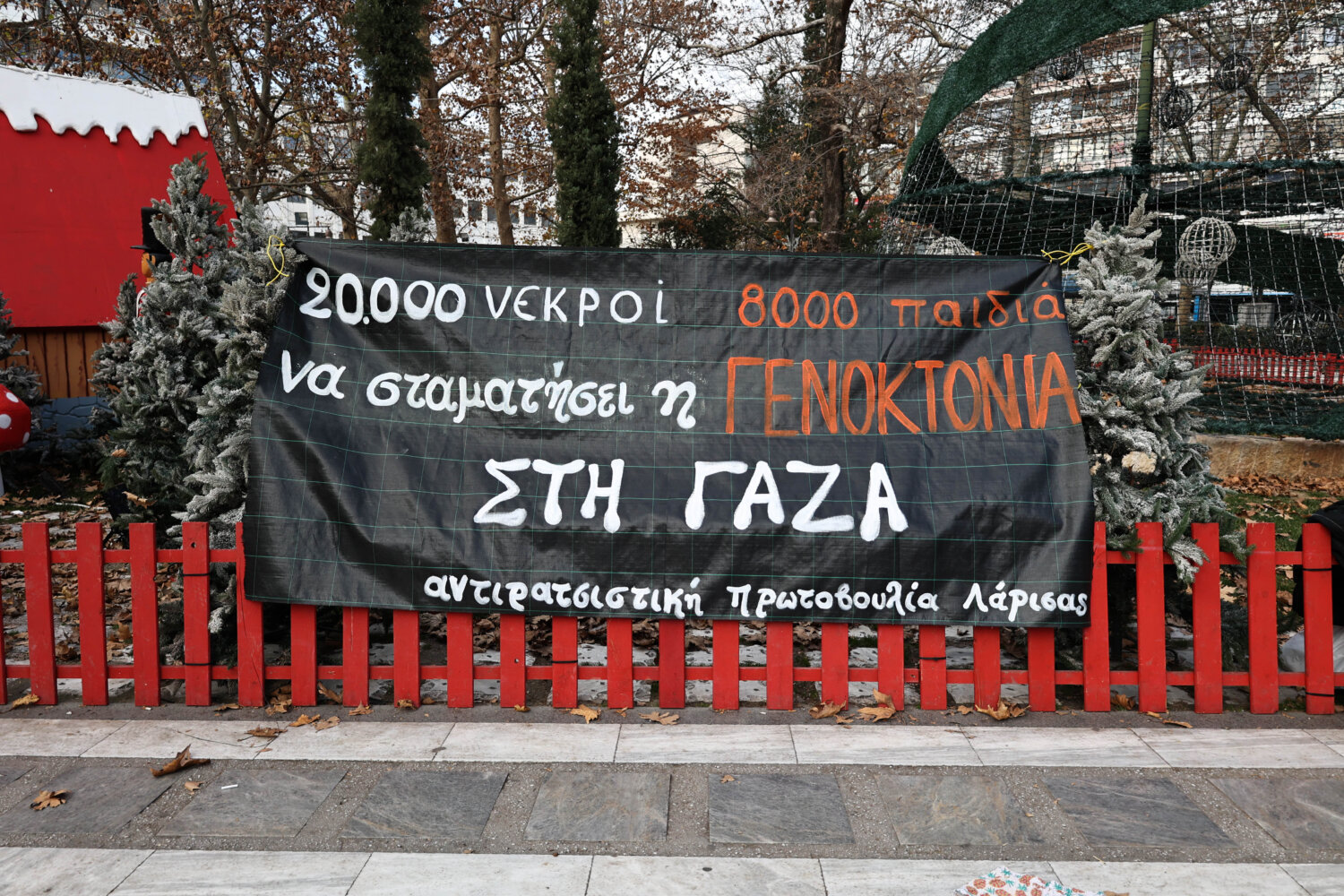 Όπως αναφέρει το larissanet.gr, αφήνοντας άδεια παιδικά ρουχάκια μπροστά από τον χριστουγεννιάτικο στολισμό στην Κεντρική Πλατεία της πόλης η συλλογικότητα καταδίκασε όσα εξελίσσονται στη Λωρίδα της Γάζας και ζήτησε «να σταματήσει η γενοκτονία στην Παλαιστίνη».