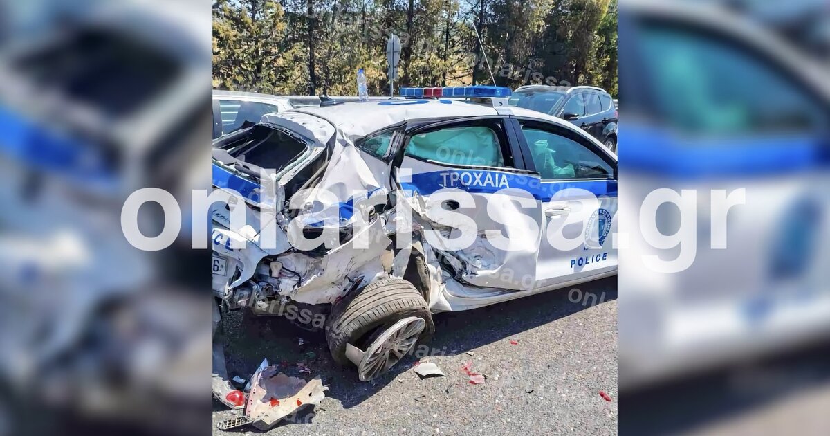 Όπως θα δείτε στην φωτογραφία του onlarissa.gr, η σύγκρουση ήταν σφοδρή, με αποτέλεσμα το περιπολικό να υποστεί μεγάλες ζημιές.