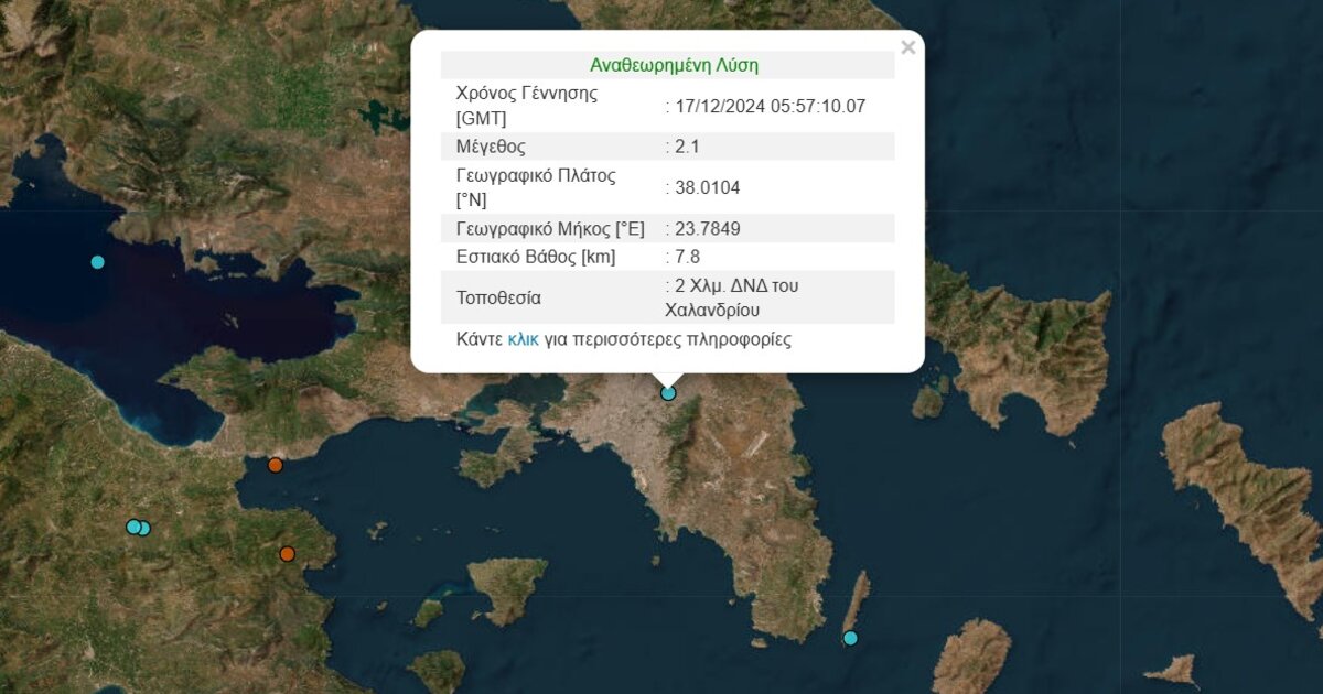 Ο σεισμός που «χτύπησε» την Αττική στις 7:57 το πρωί ήταν μεγέθους 2,1 βαθμών Ρίχτερ, με εστιακό βάθος 5 χλμ, 2 χλμ ΔΒΔ του Γέρακα.