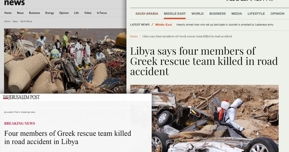 Σύμφωνα με το πρακτορείο Reuters, το οποίο επικαλείται αξιωματούχους από τη Λιβύη, τέσσερα μέλη της ελληνικής ανθρωπιστικής αποστολής έχασαν τη ζωή τους στο τροχαίο ατύχημα που έγινε έξω από την πόλη Ντέρνα.