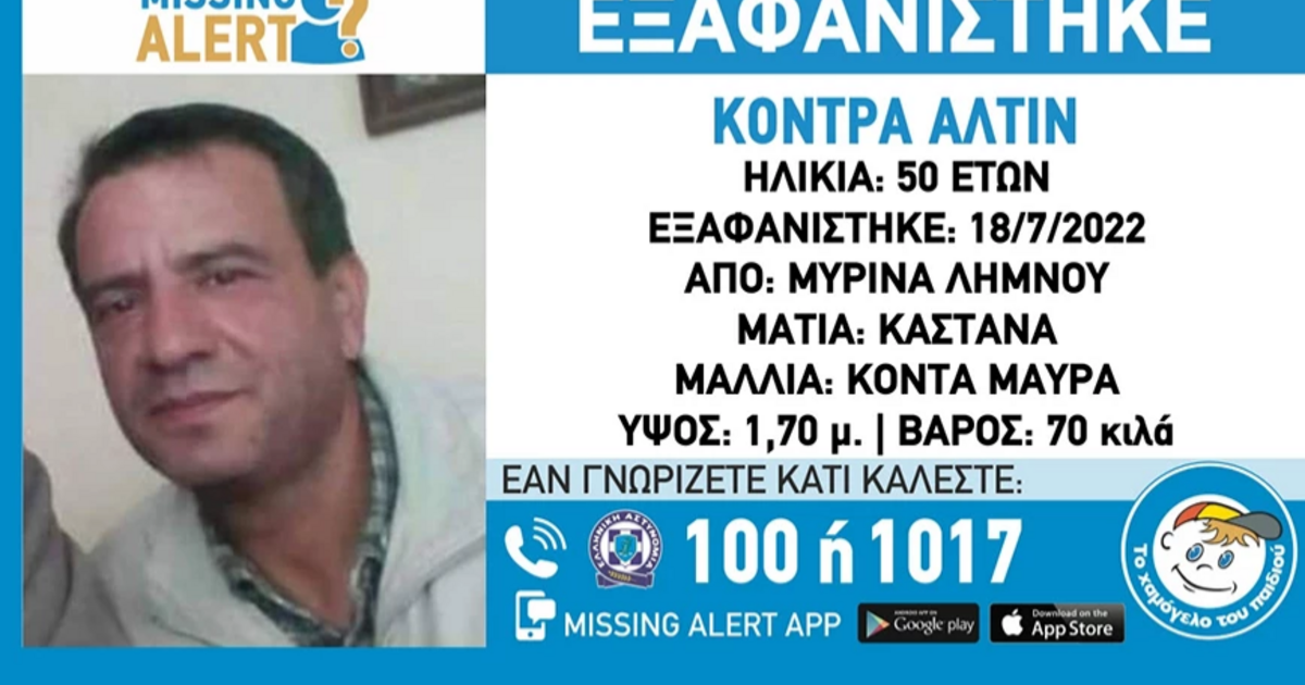 Στις 18/07/2022, εξαφανίστηκε από την περιοχή της Μύρινας Λήμνου, ο Κόντρα (επ.) Αλτίν (ον.), 50 ετών. Το «Χαμόγελο του Παιδιού» ενημερώθηκε, για την εξαφάνιση του Κόντρα (επ.) Αλτίν (ον.) και προχώρησε σήμερα 31/10/2022 στη δημοσιοποίηση των στοιχείων του ενήλικα κατόπιν αιτήματος της οικογένειας του, καθώς ενδέχεται να συντρέχουν λόγοι οι οποίοι θέτουν τη ζωή του σε κίνδυνο. Ο Κόντρα (επ.) Αλτίν (ον.) έχει ύψος 1.70 μ., έχει 70 kg βάρος, έχει κοντά μαύρα μαλλιά και καστανά μάτια. Δεν είναι γνωστό τι φορούσε ο 50χρονος την ημέρα που εξαφανίστηκε.