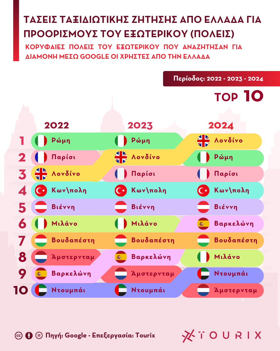 "Η διαχρονική ανάλυση της τριετίας 2022-2024 αποκαλύπτει αξιοσημείωτες αλλαγές στον χάρτη προτιμήσεων των Ελλήνων ταξιδιωτών", επισημαίνει η ερευνητική ομάδα της Tourix. "Ενώ η Ρώμη διατήρησε την πρωτιά το 2022 και 2023, το Λονδίνο σημείωσε σταθερή άνοδο από την 3η θέση το 2022 στην κορυφή το 2024. Παράλληλα, παρατηρείται σταθερότητα σε προορισμούς όπως η Κωνσταντινούπολη (4η θέση) και η Βιέννη (5η θέση), ενώ η Βαρκελώνη δείχνει αξιοσημείωτη δυναμική, ανεβαίνοντας από την 9η θέση το 2022 στην 6η το 2024. Αξίζει επίσης να σημειωθεί η σταθερή παρουσία του Ντουμπάι στο Top-10, υποδηλώνοντας το αυξανόμενο ενδιαφέρον για προορισμούς εκτός Ευρώπης."