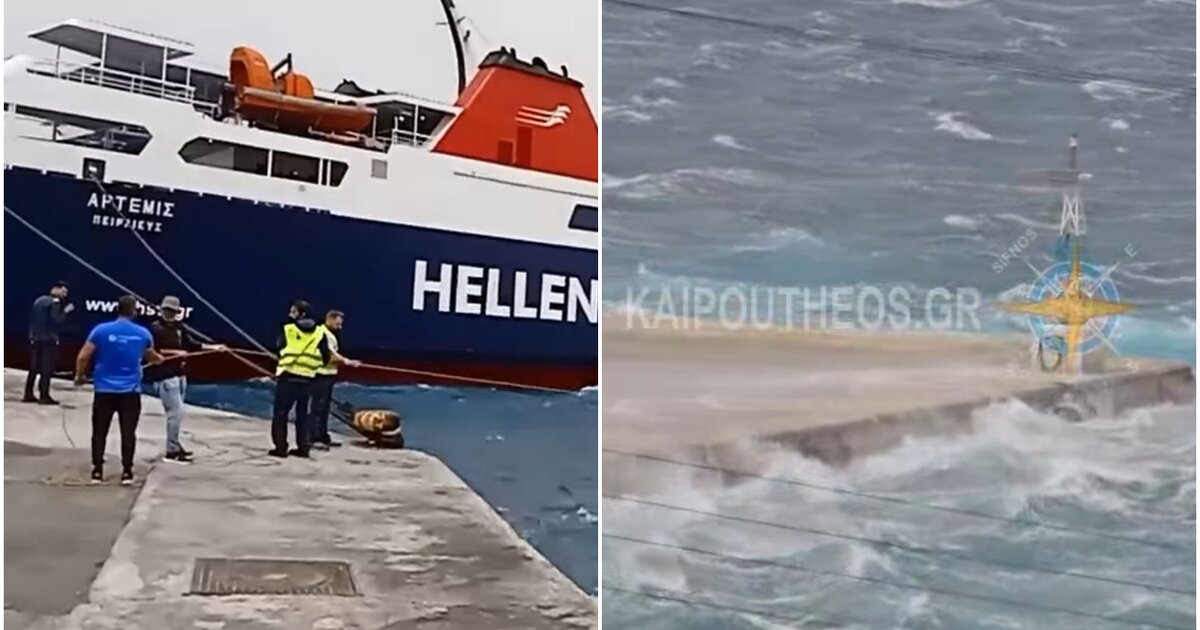 Στο πρώτο βίντεο, αποτυπώνεται η δυσκολία πρόσδεσης του πλοίου «Άρτεμις» στο λιμάνι της Σύρου, όπου οι προσπάθειες του πληρώματος να δέσουν το πλοίο γίνονται υπό ιδιαίτερα αντίξοες συνθήκες.