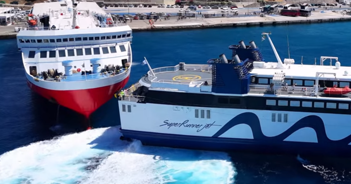 Στο βίντεο φαίνεται το Superrunner Jet να προσεγγίζει το λιμάνι της Τήνου ερχόμενο από Μύκονο, με τον καπετάνιο να κάνει μία εκπληκτική μανούβρα προκειμένου να μπει ανάποδα.
