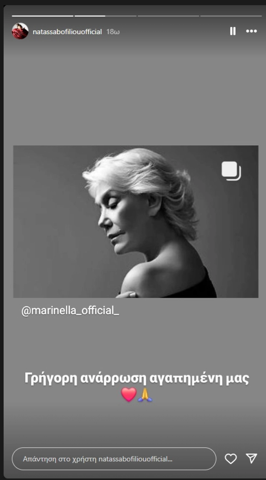 «Γρήγορη ανάρρωση αγαπημένη μας», έγραψε η Νατάσα Μποφίλιου.