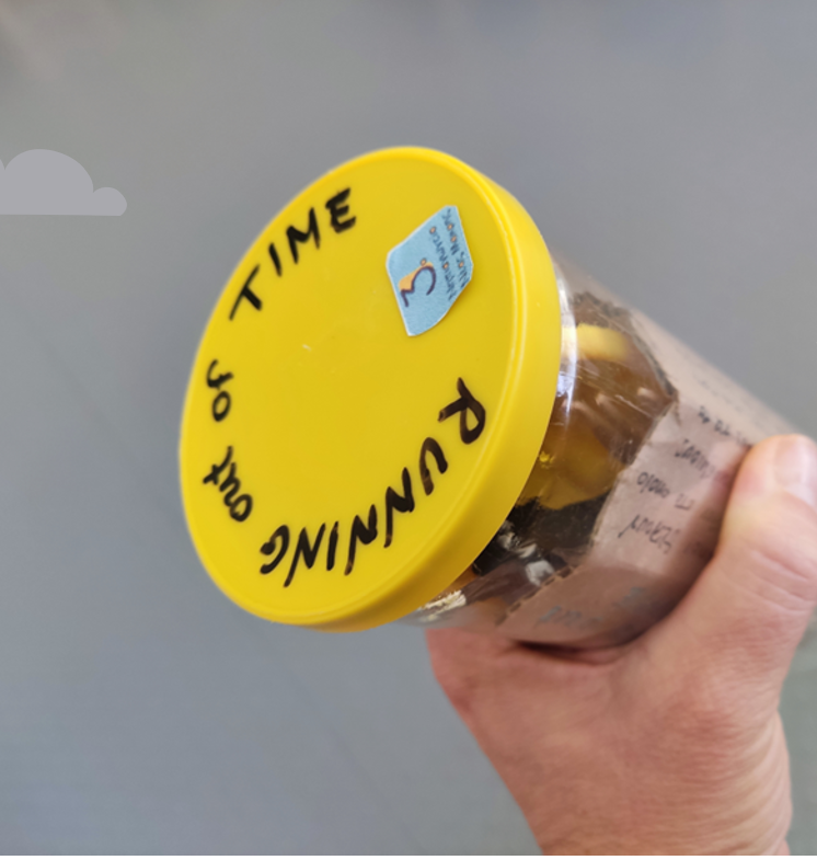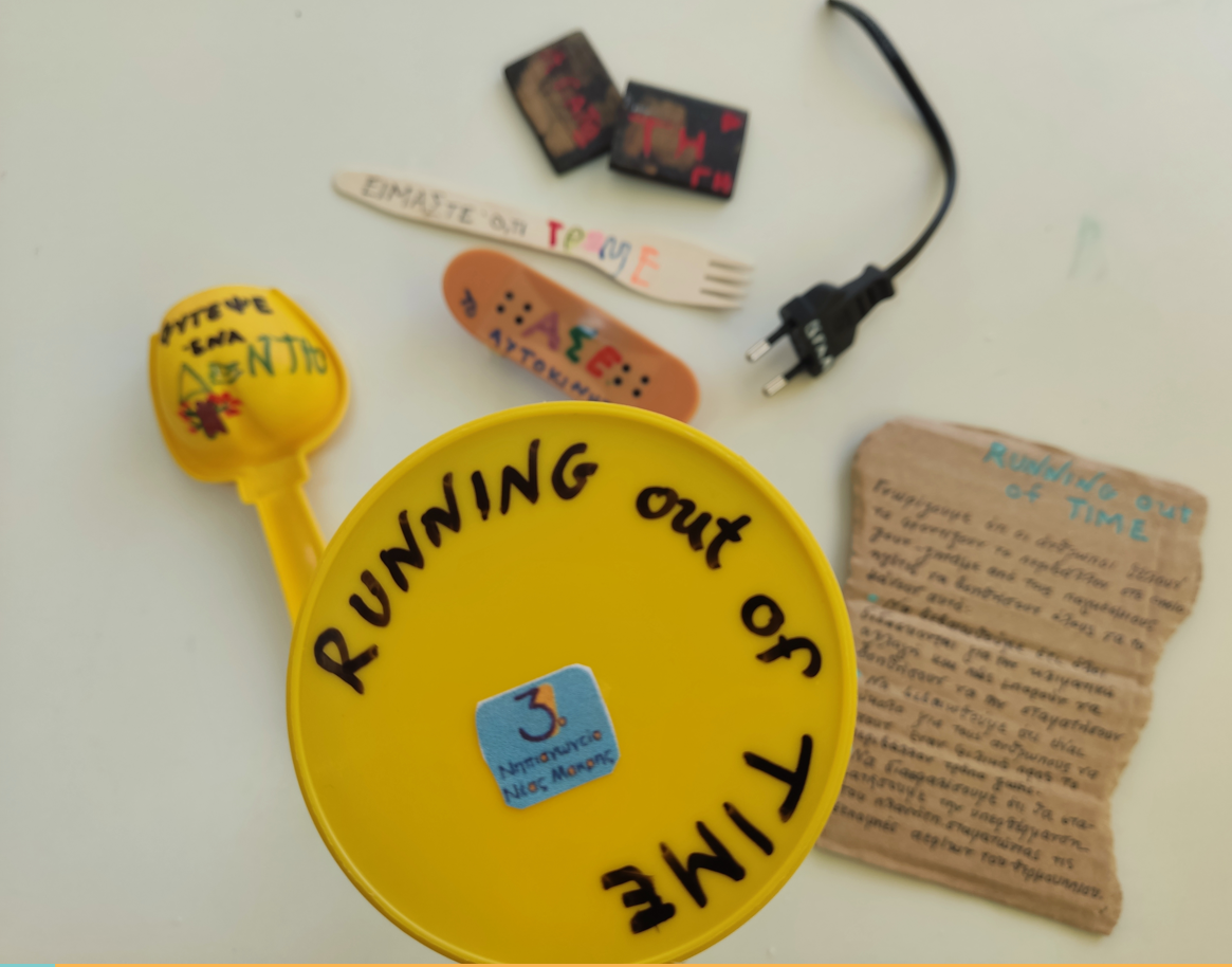 Στη συνέχεια οι μαθήτριες και οι μαθητές συνέλεξαν άχρηστα αντικείμενα, τα στόλισαν με συνθήματα και τα κράτησαν ως πλακάτ για να υποδεχτούν τους δρομείς της παγκόσμιας σκυταλοδρομίας Running out of Time που πριν λίγες μέρες πέρασε από τη γειτονιά τους.