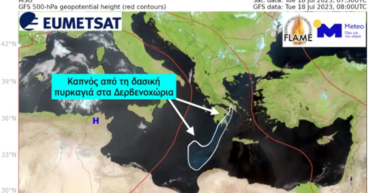 Οπτική δορυφορική εικόνα που έλαβε και επεξεργάστηκε η μονάδα Meteo του Εθνικού Αστεροσκοπείου Αθηνών (ΕΑΑ) από τον Ευρωπαϊκό δορυφόρο METEOSAT-11 δείχνει τον καπνό από τη δασική πυρκαγιά στα Δερβενοχώρια στα όρια μεταξύ Βοιωτίας και Αττικής να έχει μεταφερθεί από τους ισχυρούς βορειοανατολικούς ανέμους στις ακτές της Βόρειας Αφρικής, διανύοντας σχεδόν 700 km, το πρωί (10:30) της Τρίτης.