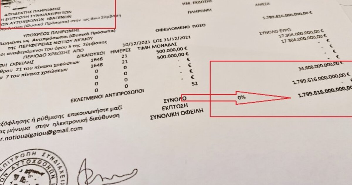 «Πρόστιμο» της τάξης του 1,7 τρισεκατομμυρίων ευρώ(!) επέβαλαν στην Περιφέρεια Νοτίου Αιγαίου, τα μέλη των... ελλήνων αυτόχθονων ιθαγενών, γεγονός που δεν... άφησε ασχολίαστο ο κ. Γιώργος Χατζημάρκος, μόλις παρέλαβε το σχετικό έγγραφο.