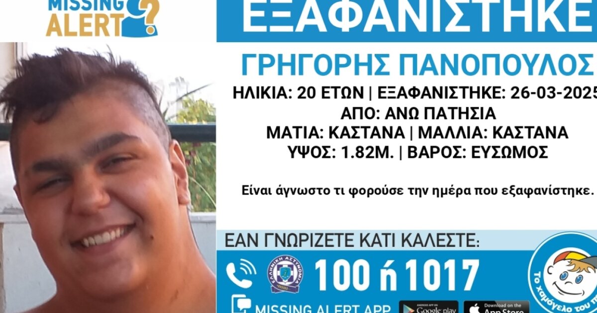 Στις 26/03/2025, απογευματινές ώρες, εξαφανίστηκε από τα Άνω Πατήσια, ο Γρηγόρης Πανόπουλος, 20 ετών.