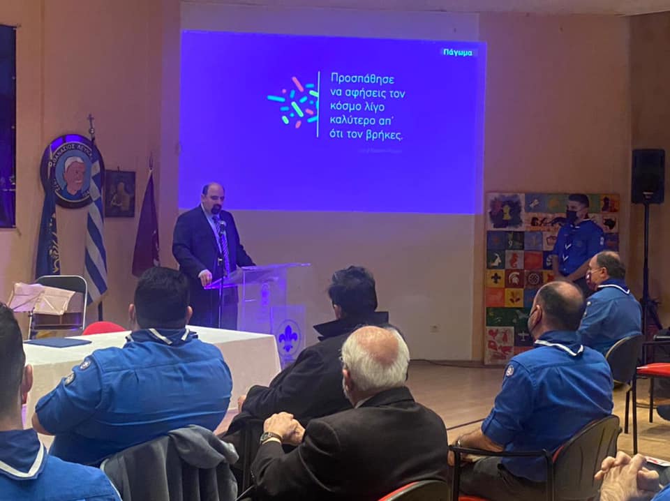 Στην ομιλία του ο κ. Τριαντόπουλος αναφέρθηκε στη νέα αντίληψη σχετικά με την αρωγή και την αποκατάσταση που στηρίζεται στη συνέργεια και την κινητοποίηση της κοινωνίας των πολιτών και στο υφιστάμενο κοινωνικό κεφάλαιο οργανισμών όπως ο Προσκοπισμός. Στάθηκε στις προκλήσεις που φέρνει για την πολιτεία η κλιματική αλλαγή και το πόσο σημαντικό είναι να βρίσκονται στο πεδίο κάποιας φυσικής καταστροφής δυνάμεις εφοδιασμένες με όλα τα μέσα προκειμένου να ανταποκρίνονται στις ανάγκες των πληττόμενων πολιτών.