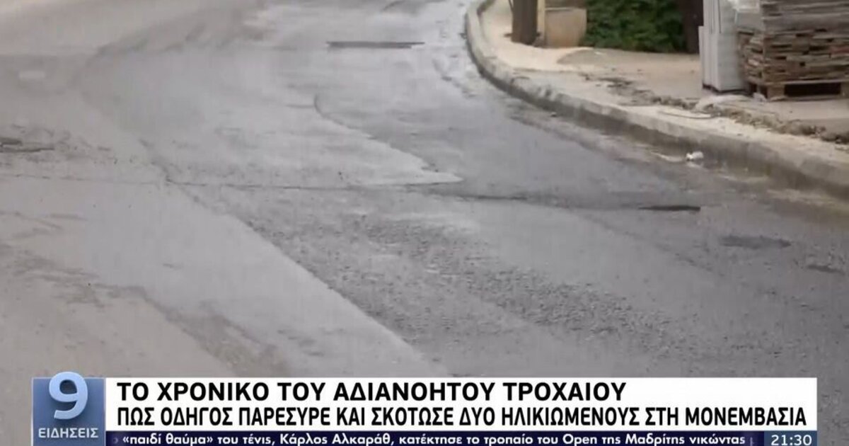 Δύο νεκροί, μία ολόκληρη κοινότητα, της Μονεμβασιάς, σε σοκ μετά από το θάνατο δύο ηλικιωμένων σε ένα απίστευτο τροχαίο δυστύχημα. Ο 50χρονος οδηγός, σε κατάσταση αμόκ, χτύπησε δυο ηλικιωμένους που επέβαιναν σε μοτοσυκλέτα, παρέσυρε τον πρώτο για 200 μέτρα, τον παράτησε νεκρό, και επέστρεψε λίγο αργότερα για να κάνει το ίδιο με τον άλλο – που επίσης κατέληξε.