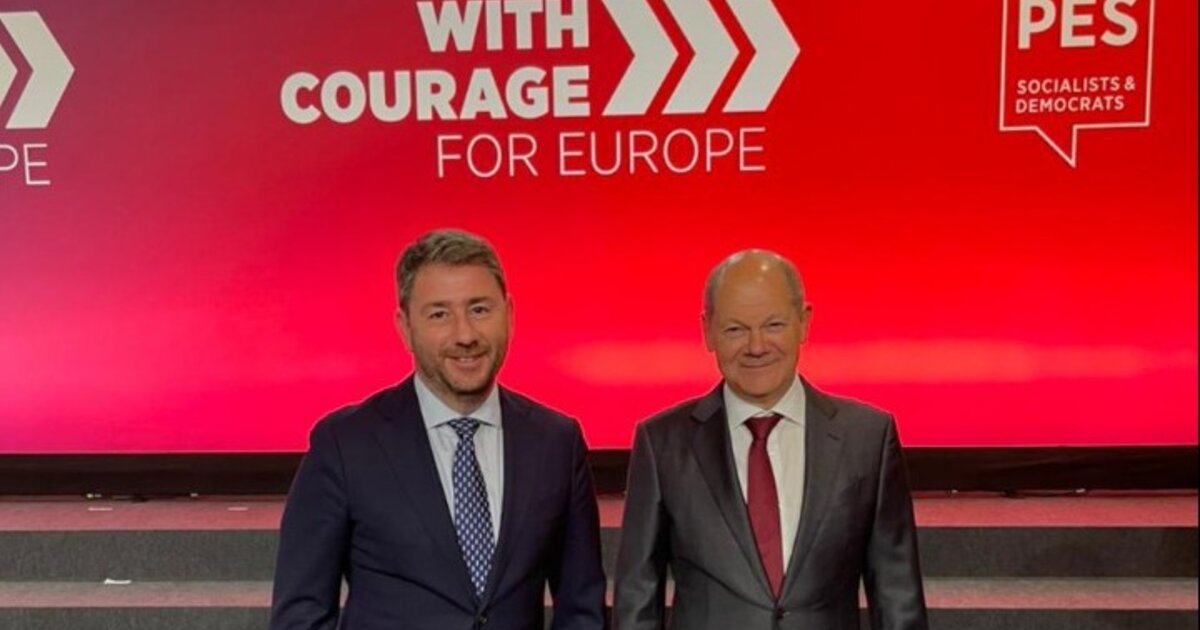 Χθες το βράδυ, στο περιθώριο του δείπνου των ηγετών του Ευρωπαϊκού Σοσιαλιστικού Κόμματος, ο πρόεδρος του ΠΑΣΟΚ-Κινήματος Αλλαγής είχε σύντομο διάλογο με τον καγκελάριο της Γερμανίας Όλαφ Σολτς.