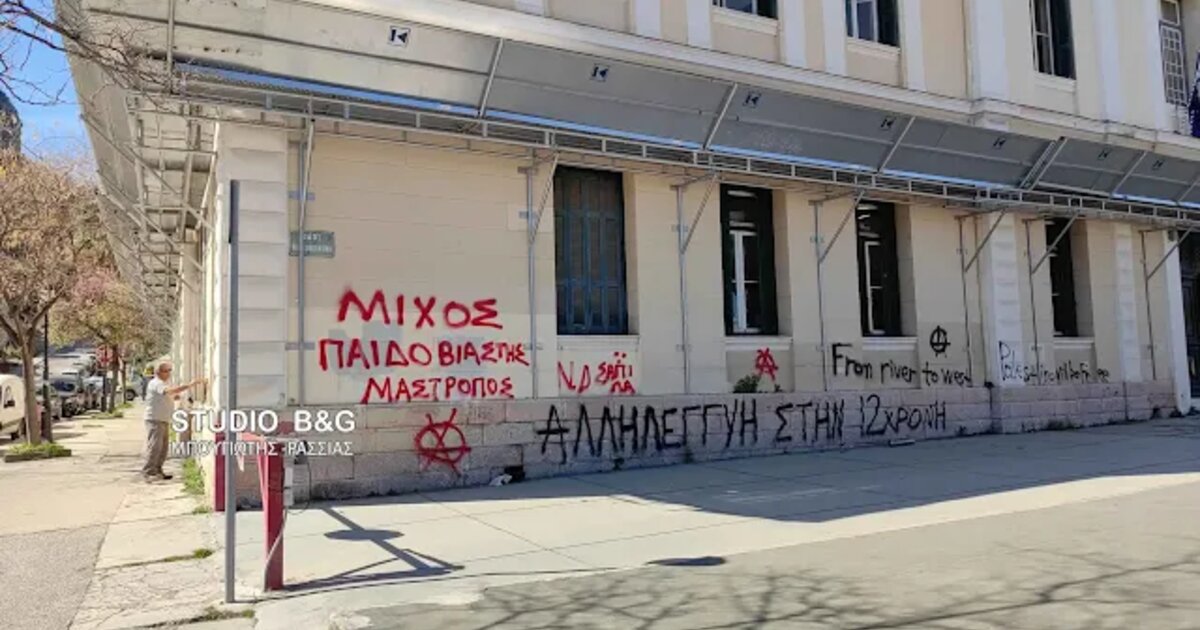 Οι δράστες έγραψαν με μπογιές συνθήματα, κατά της Ν.Δ., του Μίχου για την υπόθεση του βιασμού της 12χρονης και για την τραγωδία στα Τέμπη.