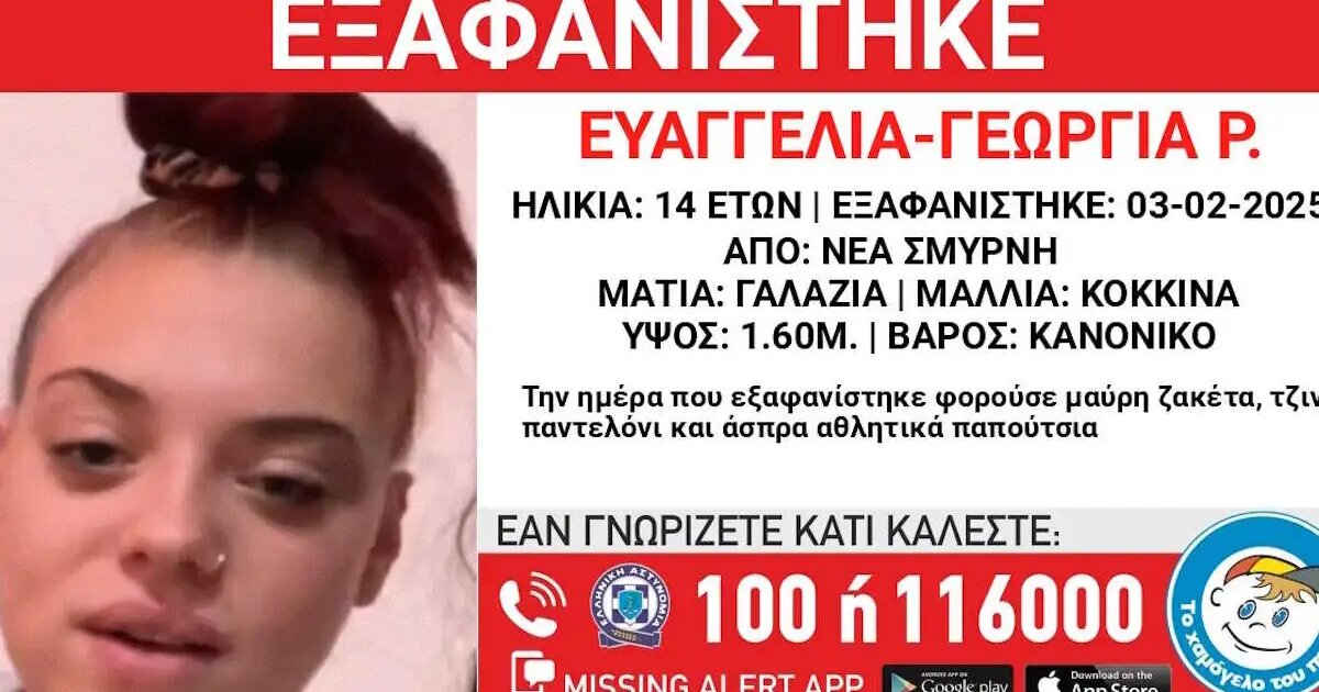 Την εξαφάνιση της Ευαγγελίας – Γεωργίας Ρ., 14 ετών, από χώρο φιλοξενίας στη Νέα Σμύρνη, γνωστοποίησε το «Χαμόγελο του Παιδιού», με ανακοίνωσή του.