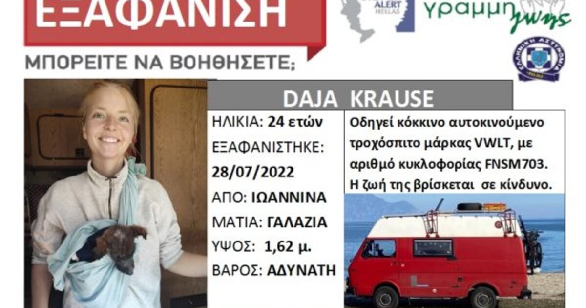 Μία 24χρονη Γερμανίδα που έκανε τουρισμό στα Ιωάννινα, εξαφανίστηκε στις 28 Ιουλίου από την περιοχή. Η Daja Krause, έκανε διακοπές με ένα κόκκινο αυτοκινούμενο τροχόσπιτο μάρκας VW LT και με αριθμό κυκλοφορίας FNSM703.