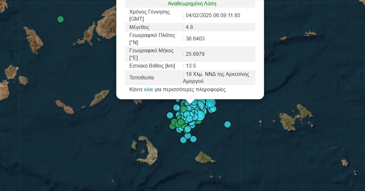 Νέος ισχυρός σεισμός 4,8 βαθμών της κλίμακας Ρίχτερ, σημειώθηκε λίγα λεπτά μετά τις οκτώ το πρωί της Τρίτης 4 Φεβρουαρίου, στην θαλάσσια περιοχή της Αμοργού.