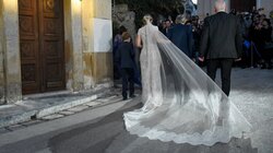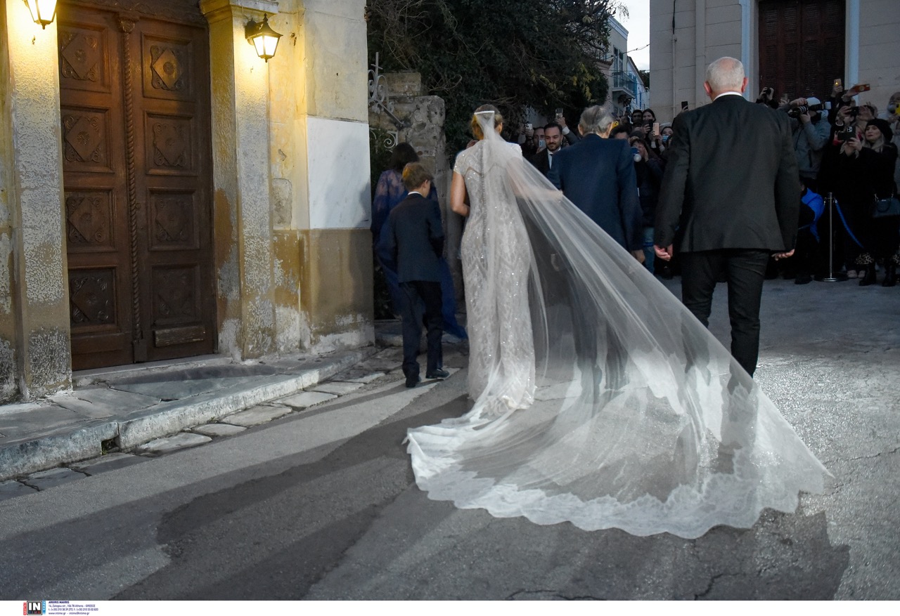 Η νύφη επέλεξε ένα δαντελένιο νυφικό σε ίσια γραμμή κεντημένο με κρύσταλλα, του γνωστού Έλληνα σχεδιαστή Χρήστου Κωσταρέλλου.