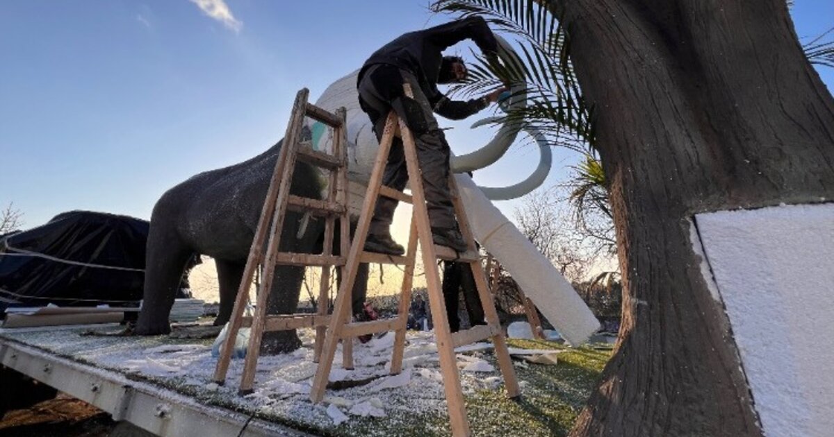 «Κάνουμε όλες τις κατασκευές πάνω στην καρότσα ή στις πλατφόρμες γιατί κάποιες είναι μεγάλες, όπως το μαμούθ -έχει διαστάσεις 6x4μ.- έχουμε φτιάξει τις σπηλιές, τα νερά. Δεκατέσσερις ημέρες κολλάμε κομμάτι κομμάτι να μπει μέχρι και η τρίχα ώστε να είναι τέλεια απομίμηση» σημειώνει ο 60χρονος.