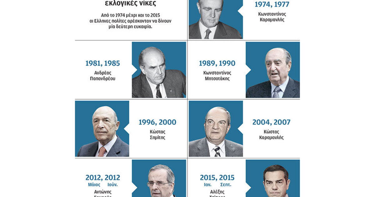 Οι αριθμοί δεν λένε πάντα την αλήθεια, αλλά έχουν πάντα ενδιαφέρον. Αν ξεφύγει κανείς από την καθημερινότητα της πολιτικής αντιπαράθεσης και δει τη μεγάλη εικόνα της Μεταπολίτευσης, θα διαπιστώσει πως οι Ελληνες πολίτες αρέσκονταν να δίνουν πάντα δύο ευκαιρίες στους πρωθυπουργούς πριν περάσουν στον επόμενο. Μοναδική εξαίρεση με μία εκλογική νίκη αποτέλεσε ο Γιώργος Παπανδρέου την ταραγμένη περίοδο των μνημονίων, καθώς κέρδισε το 2009, αλλά το 2011 υπό το βάρος των οικονομικών εξελίξεων αποχώρησε από την πρωθυπουργία. Ας δούμε αναλυτικά τι συνέβη στις 18 εκλογικές αναμετρήσεις της Μεταπολίτευσης: