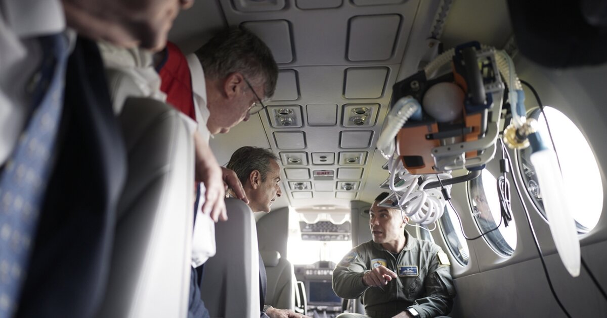 Ο Κυριάκος Μητσοτάκης επισκέφθηκε στην Ελευσίνα το νέο αεροπλάνο διακομιδών του ΕΚΑΒ