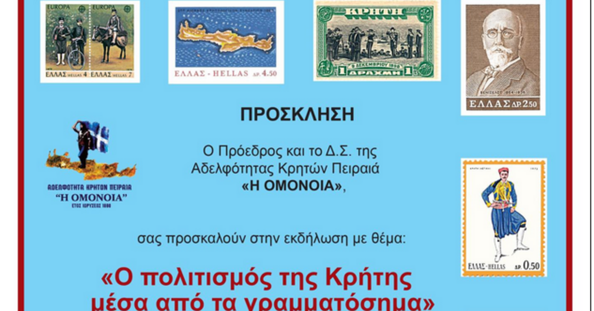 Μια ενδιαφέρουσα εκδήλωση πραγματοποιεί η Αδελφότητα Κρητών Πειραιά "Η ΟΜΟΝΟΙΑ" με θέμα "Ο πολιτισμός της Κρήτης μέσα από γραμματόσημα".