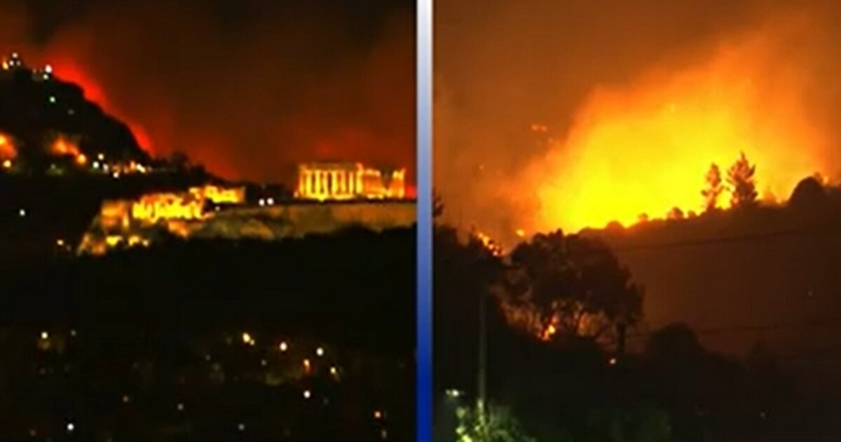 Οι φλόγες φαίνονται από όλες τις περιοχής της Αττικής, ενώ απόκοσμες είναι οι εικόνες της φωτιάς από την Ακρόπολη.