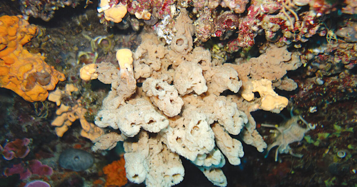 Κεντρική φωτογραφία: Φαινόμενα θνησιμότητας που σχετίζονται με την παγκόσμια κλιματική αλλαγή επηρεάζουν ολοένα και συχνότερα τους σπόγγους. Στη φωτογραφία διακρίνεται πρόσφατα νεκρωμένο άτομο του σπόγγου Agelas oroides που έχει χάσει το μεγαλύτερο μέρος του ζωντανού ιστού και είναι ορατός μόνο ο σκελετός του (φωτογραφία: Βασίλης Γεροβασιλείου).