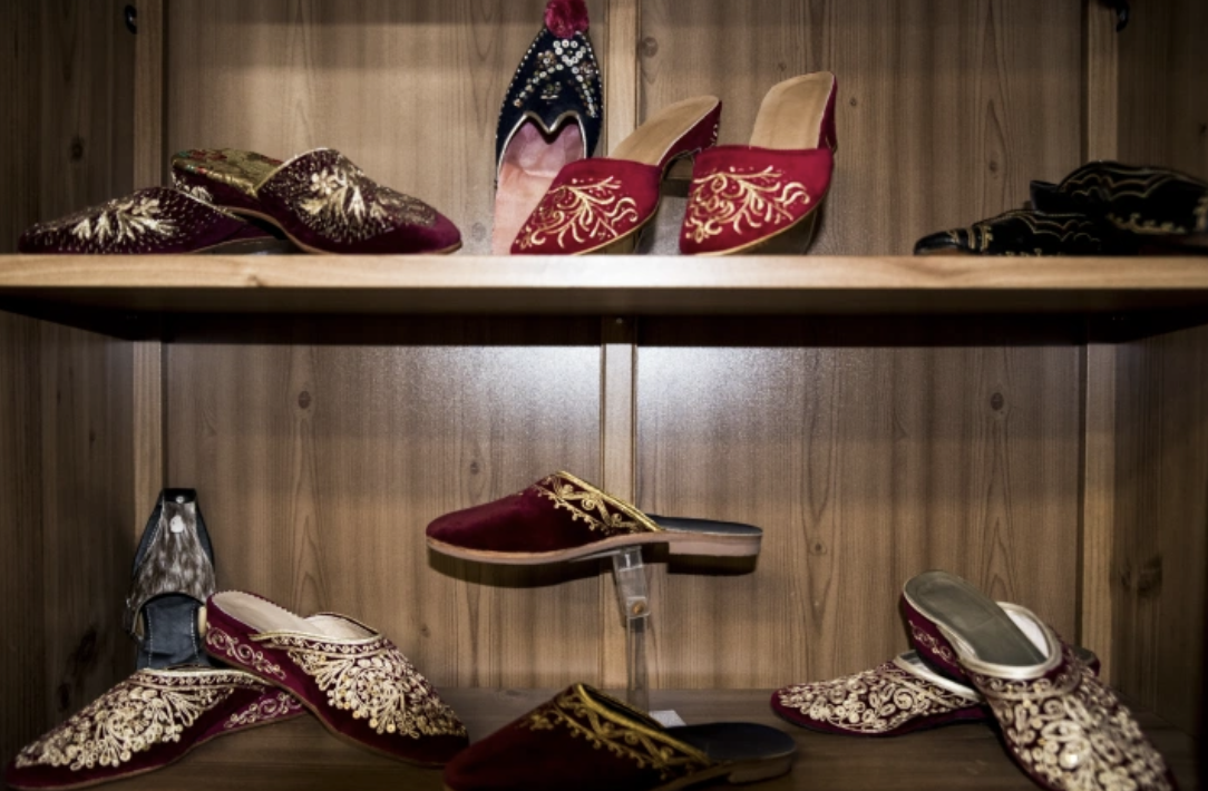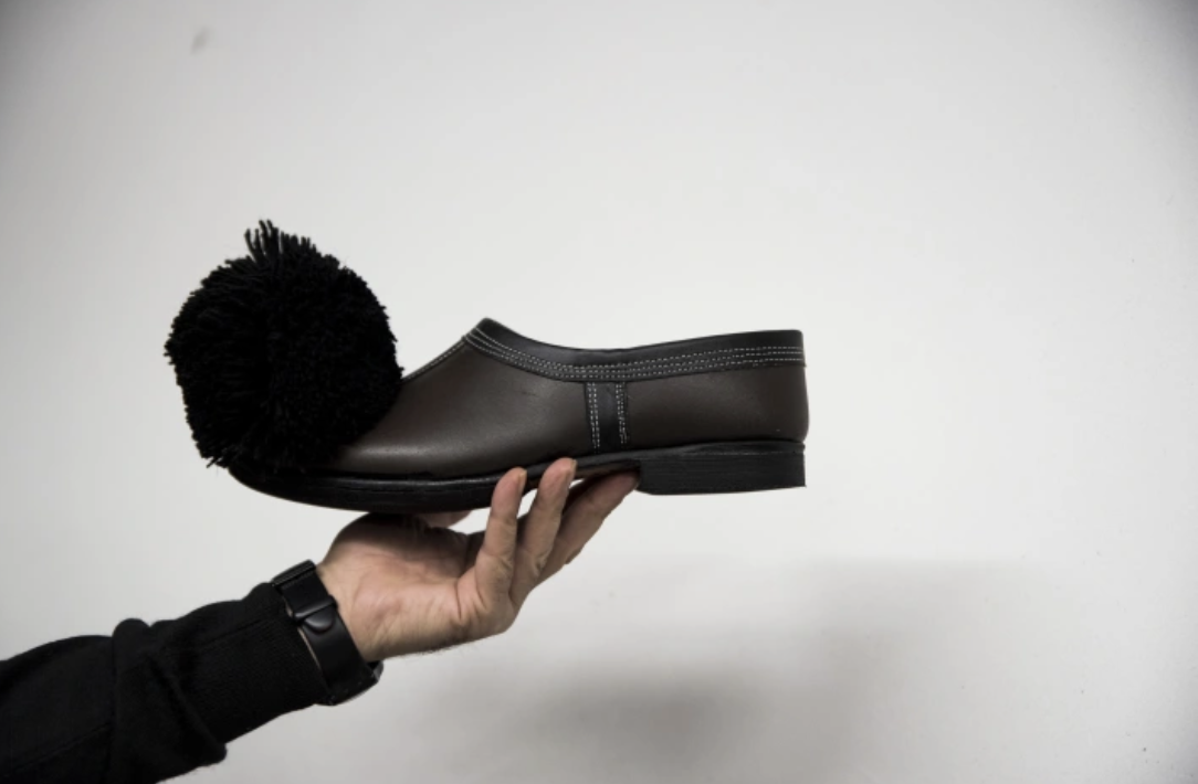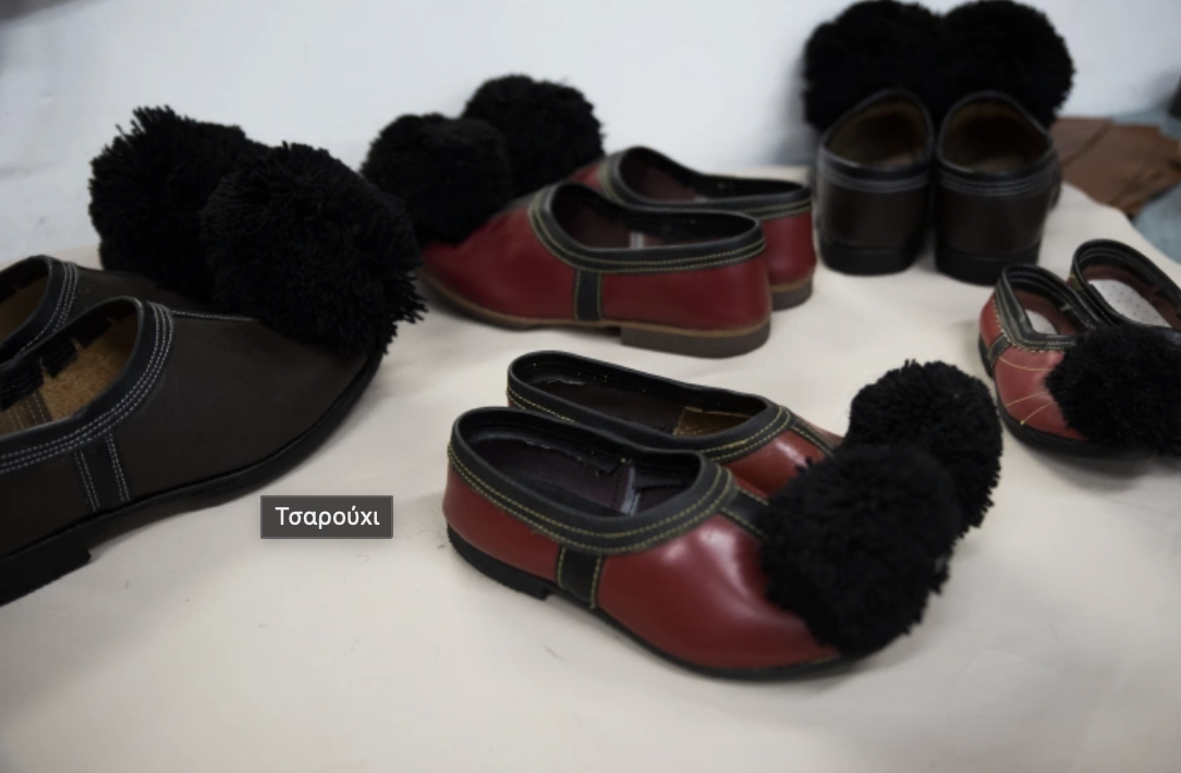 Δεκάδες καλαπόδια, πλαστικά ή ξύλινα, και τσαρούχια σε κάθε γωνιά του χώρου, μυρίζουν έντονα δέρμα. Μερικά γυαλιστερά έτοιμα για χρήση, άλλα μισοτελειωμένα, για ενήλικους ή παιδικά, με ή χωρίς τη φούντα τους, ανάμεσά τους και δυο-τρία συλλεκτικά που θα μπορούσαν να εκτίθενται σε κάποιο λαογραφικό μουσείο, όλα τους προορίζονται για ξεχωριστή χρήση.