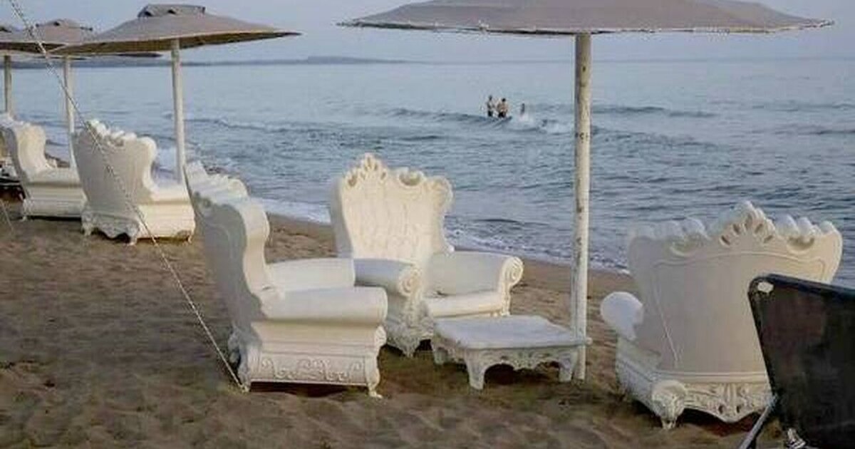 Παράλληλα, στην Κουρούτα Αμαλιάδας οι ξαπλώστρες πάνω στο κύμα, αντικαταστάθηκαν από... μεγάλες λευκές πολυθρόνες μπαρόκ, με τις εικόνες να προκαλούν ποικίλα σχόλια στα social media.