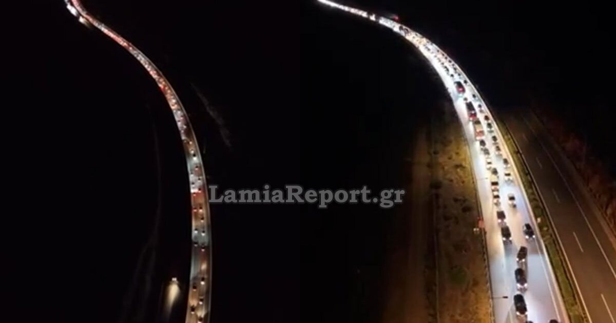 Ένα ατέλειωτο «φωτεινό ποτάμι» αποτυπώνεται στο drone του Γιώργου Καβάλλα για το LamiaReport, με τους εξοδούχους του τριημέρου να ταλαιπωρούνται από το «90» μέχρι το Ακραίφνιο, εξαιτίας έργων.