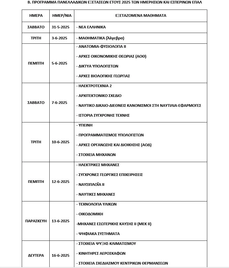 Β. ΠΡΟΓΡΑΜΜΑ ΠΑΝΕΛΛΑΔΙΚΩΝ ΕΞΕΤΑΣΕΩΝ ΕΤΟΥΣ 2025 ΤΩΝ ΗΜΕΡΗΣΙΩΝ ΚΑΙ ΕΣΠΕΡΙΝΩΝ ΕΠΑΛ