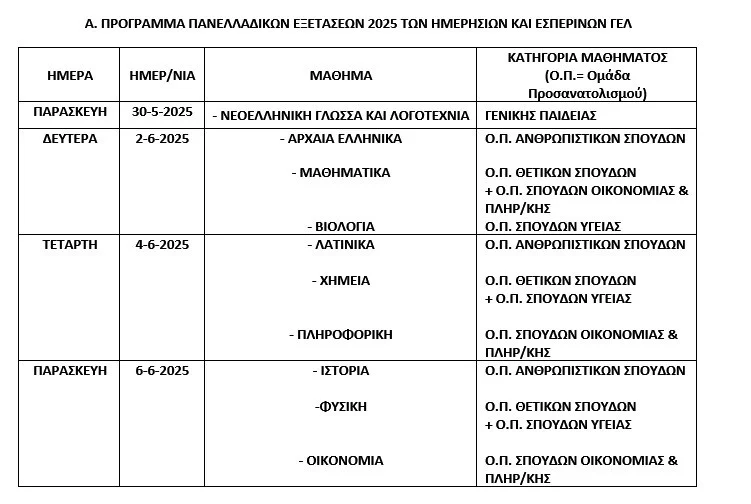 Α. ΠΡΟΓΡΑΜΜΑ ΠΑΝΕΛΛΑΔΙΚΩΝ ΕΞΕΤΑΣΕΩΝ 2025 των ημερήσιων και εσπερινών ΓΕΛ