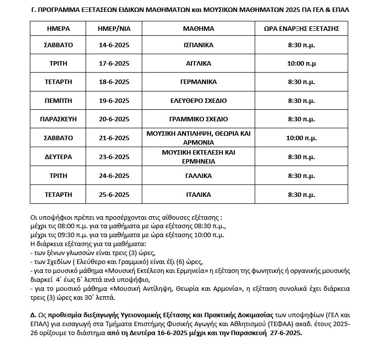 Γ. ΠΡΟΓΡΑΜΜΑ ΕΞΕΤΑΣΕΩΝ ΕΙΔΙΚΩΝ ΜΑΘΗΜΑΤΩΝ και ΜΟΥΣΙΚΩΝ ΜΑΘΗΜΑΤΩΝ 2025 ΓΙΑ ΓΕΛ & ΕΠΑΛ