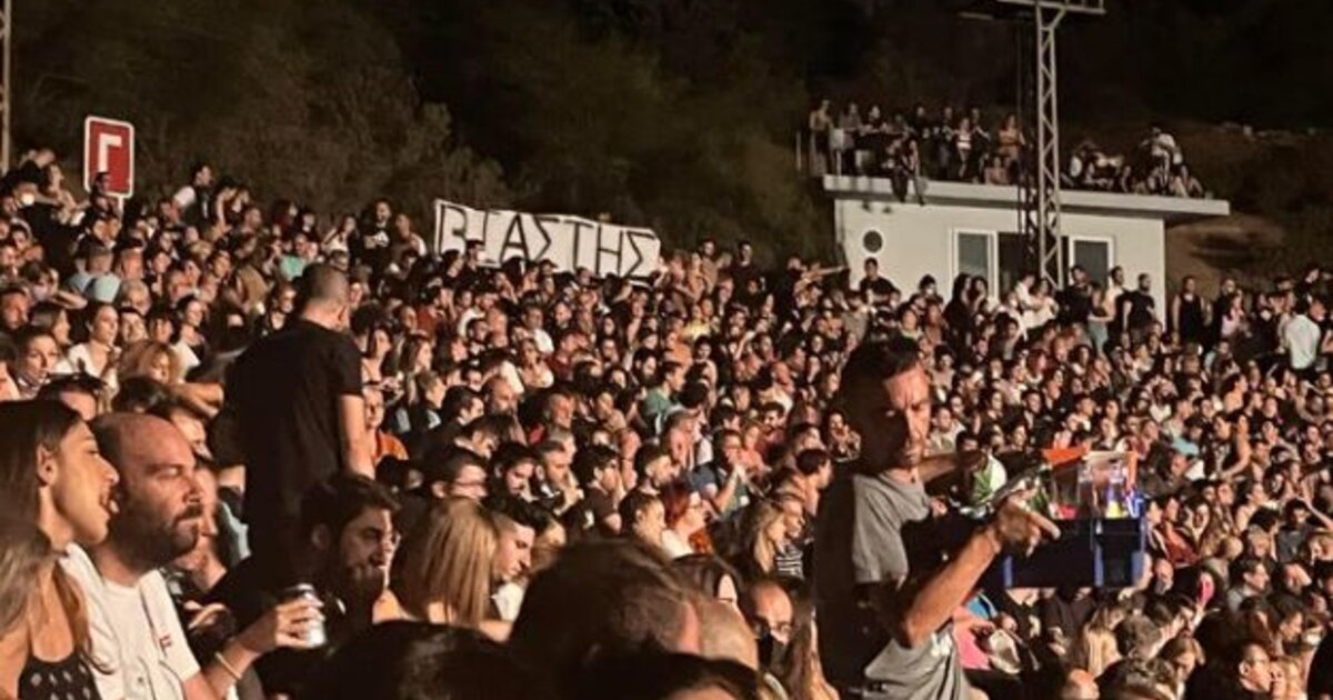Το ίδιο πανό ανέβηκε και στη συναυλία του Θανάση Παπακωνσταντίνου που πραγματοποιήθηκε το βράδυ της Δευτέρας στο Κατράκειο Θέατρο.