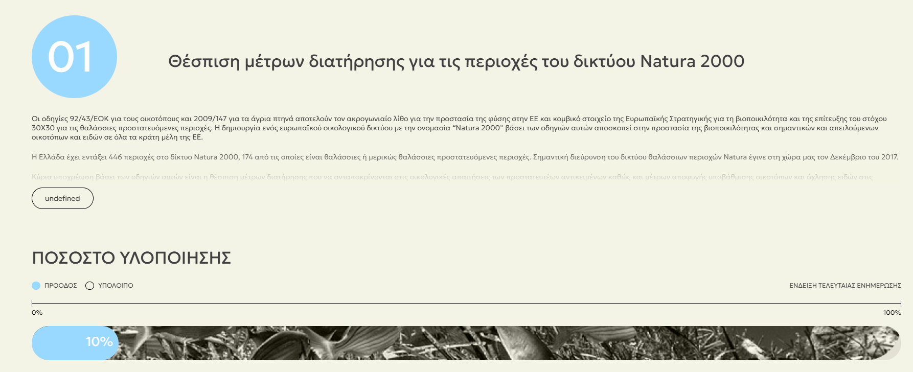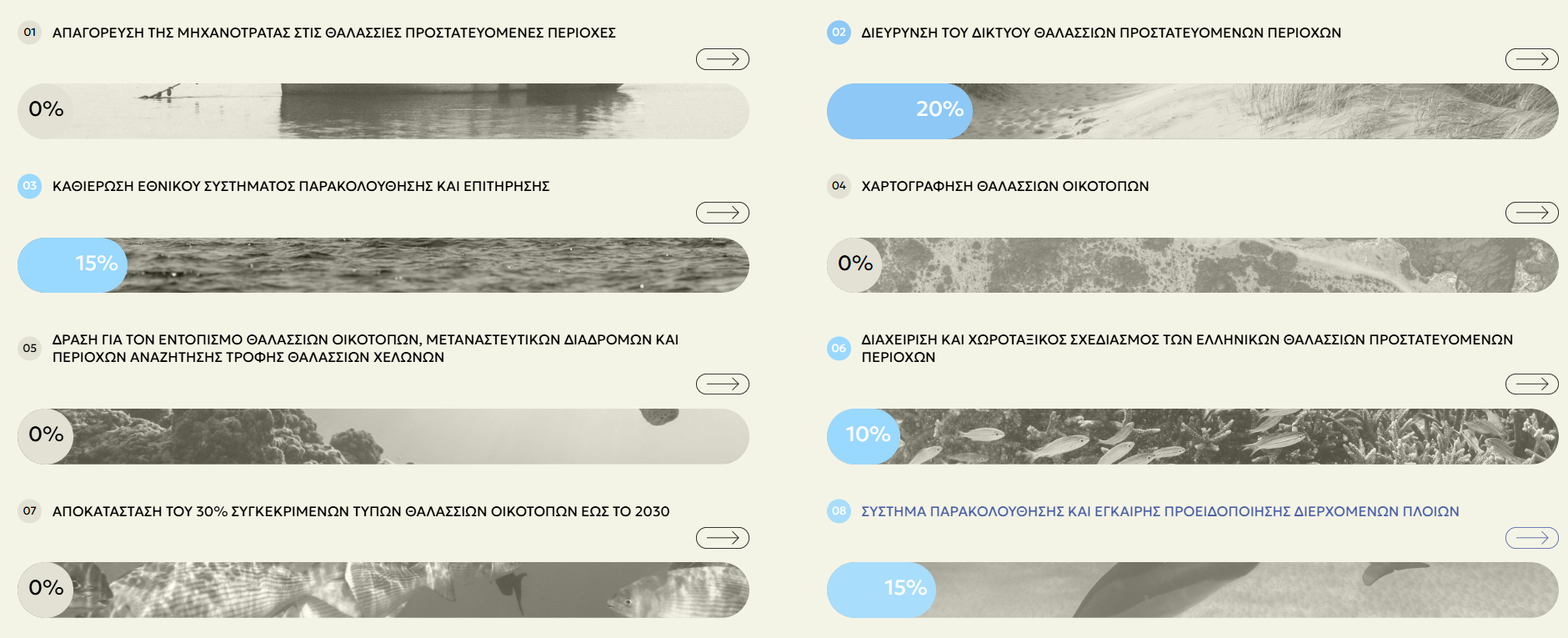 - Φύλαξη ΘΠΠ: Η δέσμευση για καθιέρωση εθνικού συστήματος παρακολούθησης και επιτήρησης με προθεσμία υλοποίησης το 2025 βρίσκεται επίσης, σε αρχικό στάδιο αξιολόγησης προσφορών των υποψηφίων αναδόχων.