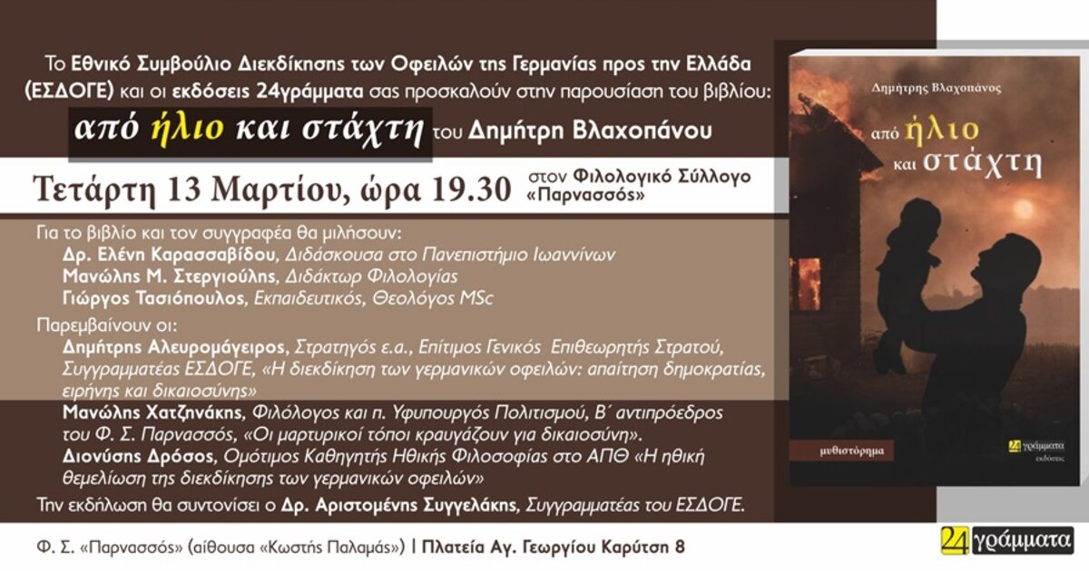 Το βιβλίο του Δημήτρη Βλαχοπάνου «από ήλιο και στάχτη», παρουσιάζουν την Τετάρτη 13 Μαρτίου και ώρα 7.30 μ.μ. στον Φιλολογικό Σύλλογο «Παρνασσός», αίθουσα «Κωστής Παλαμάς» (Πλατεία Αγ. Γεωργίου Καρύτση 8), το Εθνικό Συμβούλιο Διεκδίκησης των Οφειλών της Γερμανίας προς την Ελλάδα (ΕΣΔΟΓΕ) και οι εκδόσεις 24 γράμματα.