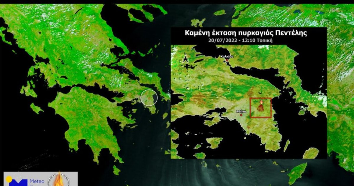 Συγκεκριμένα, το meteo.gr του Εθνικού Αστεροσκοπείου Αθηνών είχε δημοσιεύσει εικόνα από το δορυφόρο Terra (όργανο MODIS) την Τετάρτη 20.07.2022 στις 12:10 τοπική ώρα, εκτιμώντας ότι η έκταση που επηρεάστηκε από τη δασική πυρκαγιά στην Πεντέλη, έφτανε στα 24.700 στρέμματα.
