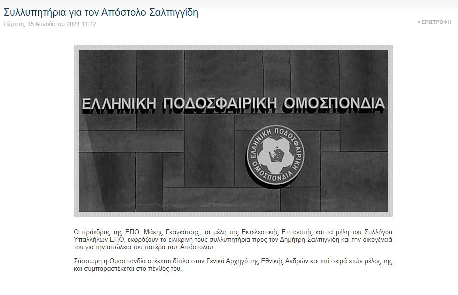 «Ο πρόεδρος της ΕΠΟ, Μάκης Γκαγκάτσης, τα μέλη της Εκτελεστικής Επιτροπής και τα μέλη του Συλλόγου Υπαλλήλων ΕΠΟ, εκφράζουν τα ειλικρινή τους συλλυπητήρια προς τον Δημήτρη Σαλπιγγίδη και την οικογένειά του για την απώλεια του πατέρα του, Απόστολου. Σύσσωμη η Ομοσπονδία στέκεται δίπλα στον Γενικό Αρχηγό της Εθνικής Ανδρών και επί σειρά ετών μέλος της και συμπαραστέκεται στο πένθος του», αναφέρεται στην ανακοίνωση.