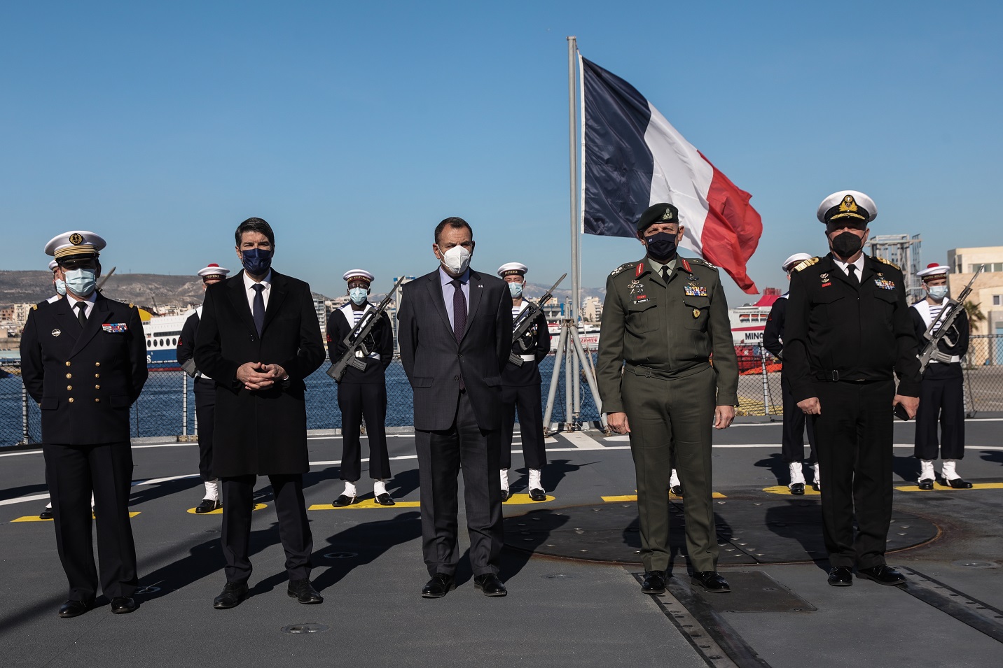 Όπως ανακοινώθηκε, τον υπουργό συνόδευσαν ο αρχηγός του Γενικού Επιτελείου Εθνικής Άμυνας (ΓΕΕΘΑ) στρατηγός Κωνσταντίνος Φλώρος και ο αρχηγός του Γενικού Επιτελείου Ναυτικού (ΓΕΝ) αντιναύαρχος Στυλιανός Πετράκης. Τον υπουργό Εθνικής Άμυνας υποδέχθηκε στη φρεγάτα τύπου FREMM ο πρέσβης της Γαλλίας στην Ελλάδα Πατρίκ Μεζονέβ.