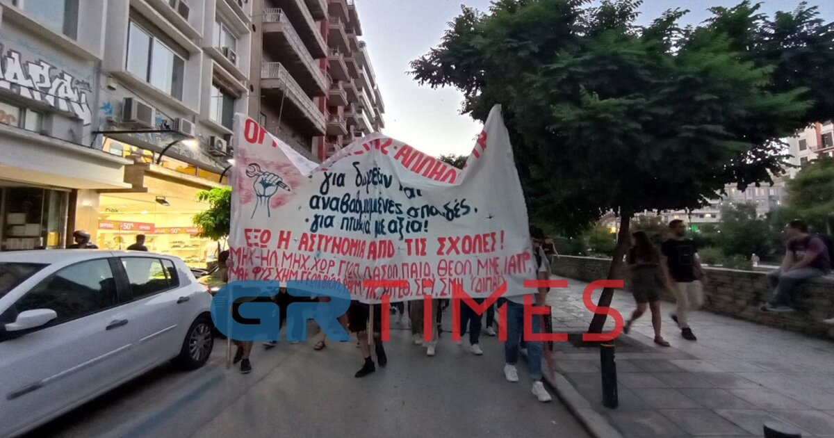 Πορεία διαμαρτυρίας πραγματοποιούν αυτήν την ώρα σε κεντρικούς δρόμους της Θεσσαλονίκης, μέλη φοιτητικών συλλόγων που νωρίτερα είχαν συγκεντρωθεί στην πλατεία Αγίας Σοφίας, με κεντρικό σύνθημα “έξω η αστυνομία από τις σχολές μας”.
