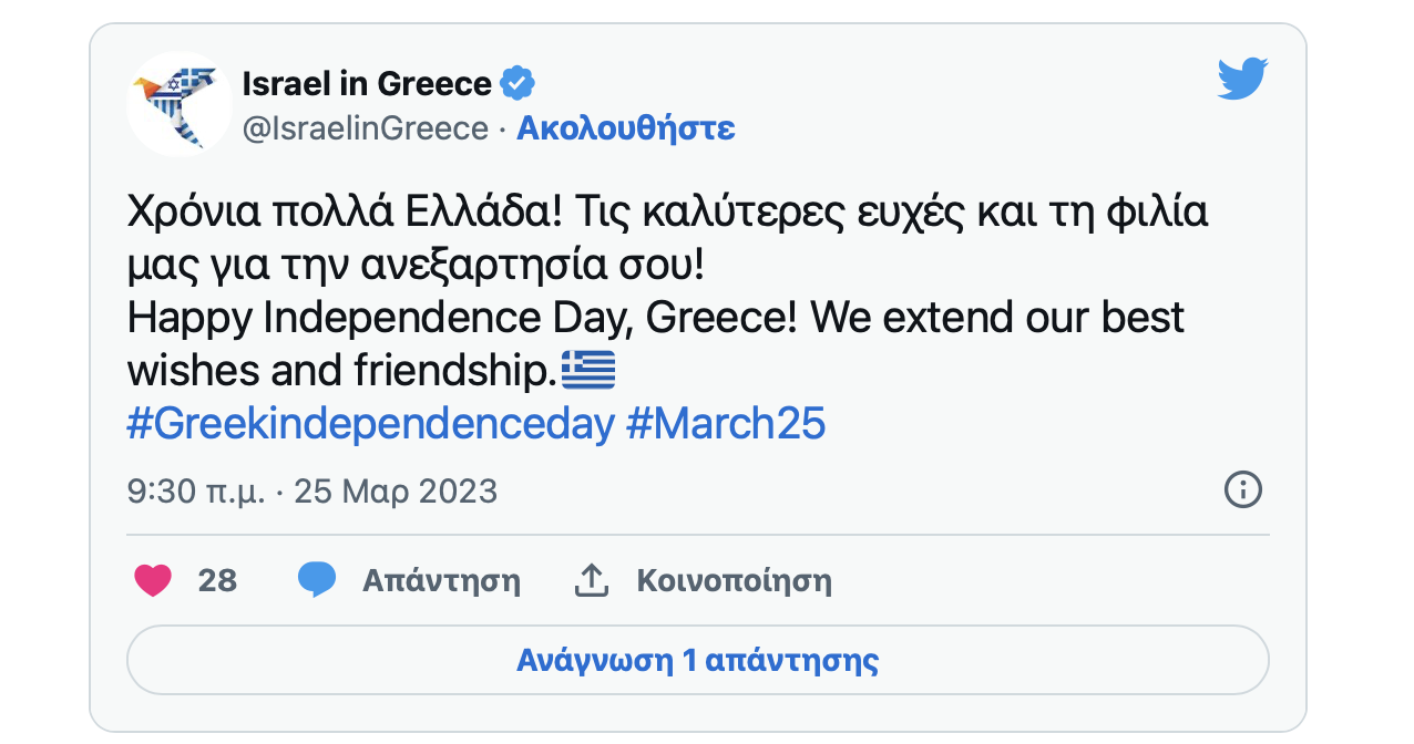 Πρεσβεία Ισραήλ: «Χρόνια πολλά στον ελληνικό λαό για την εθνική Ημέρα Ανεξαρτησίας»