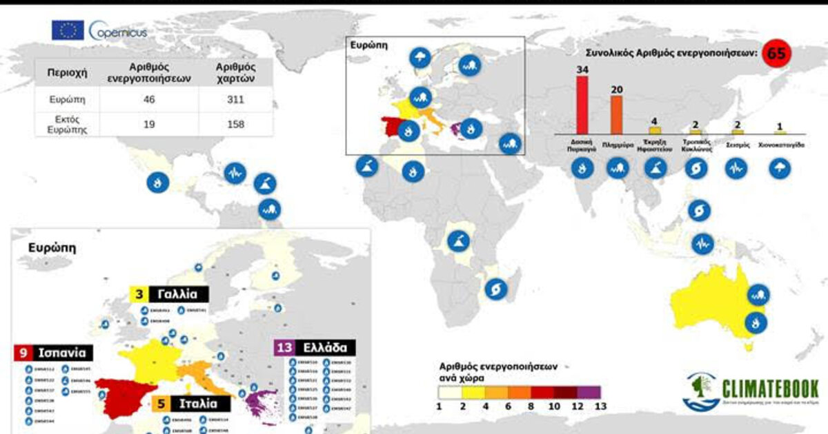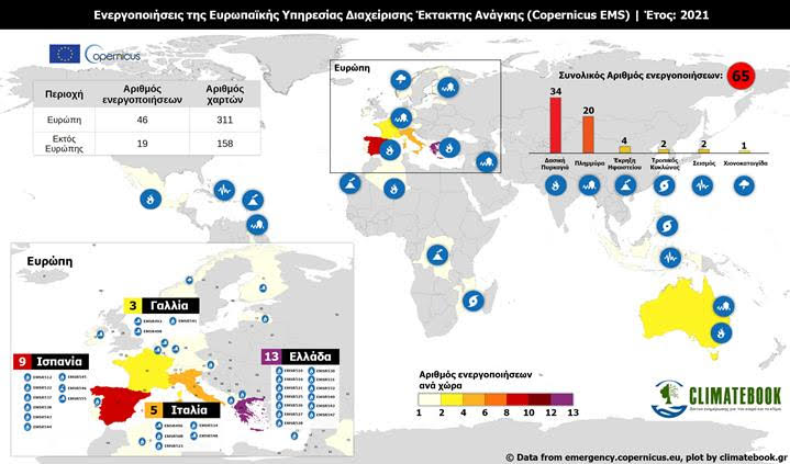 Σύμφωνα με δεδομένα της Ευρωπαϊκής Υπηρεσίας Διαχείρισης Έκτακτης Ανάγκης Copernicus (Copernicus EMS) που δημοσίευσε το Climatebook.gr, η Ελλάδα ήταν η χώρα με τις περισσότερες ενεργοποιήσεις κατά τη διάρκεια του 2021 παγκοσμίως, δείχνοντας την αυξημένη ανάγκη για βοήθεια κατά τη διάρκεια φυσικών καταστροφών που έπληξαν τη χώρα μας.