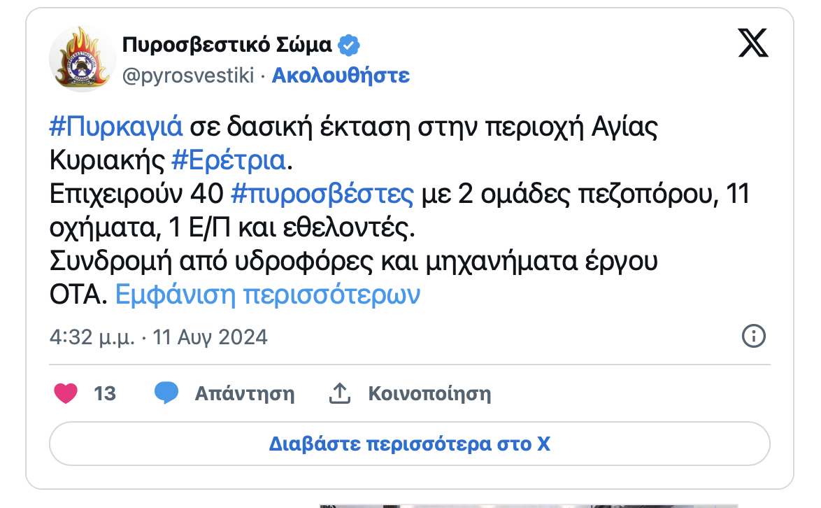 Πυρκαγιά ξέσπασε το μεσημέρι της Κυριακής 11/08 σε δασική έκταση στην περιοχή Αγίας Κυριακής στην Ερέτρια.
