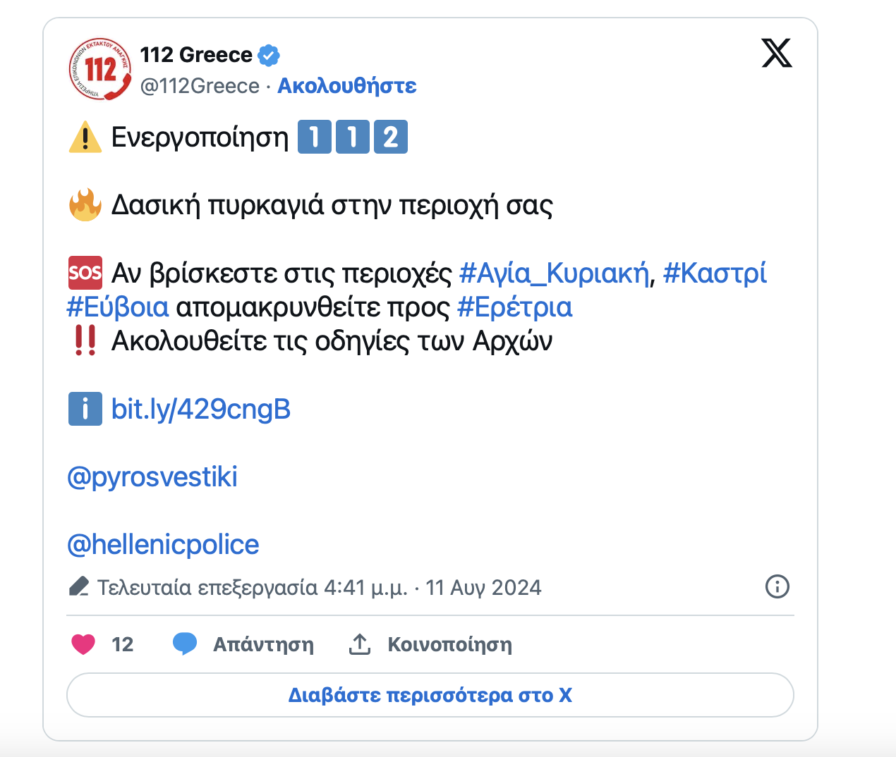 Μήνυμα του 112 για εκκένωση