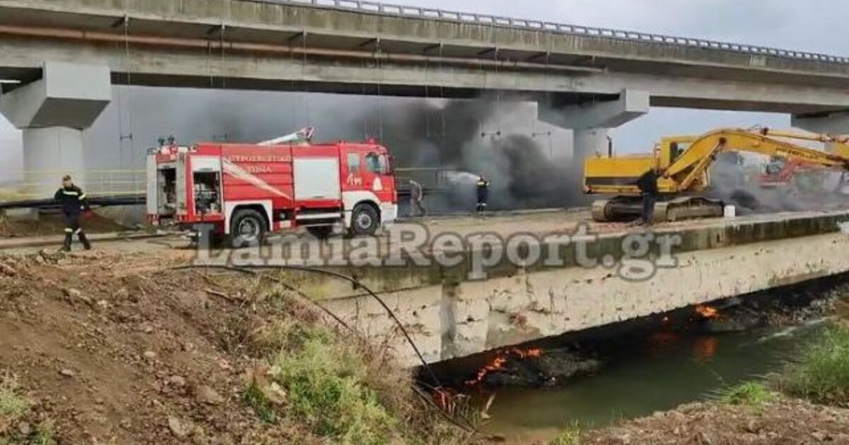 Στις φλόγες τυλίχτηκαν φελιζόλ κι άλλα φερτά υλικά στην αερογέφυρα του αεροδρομίου Λαμίας, όπου διεξάγονται εργασίες διάνοιξης της κοίτης του ρέματος της Γερμανικής τάφρου.