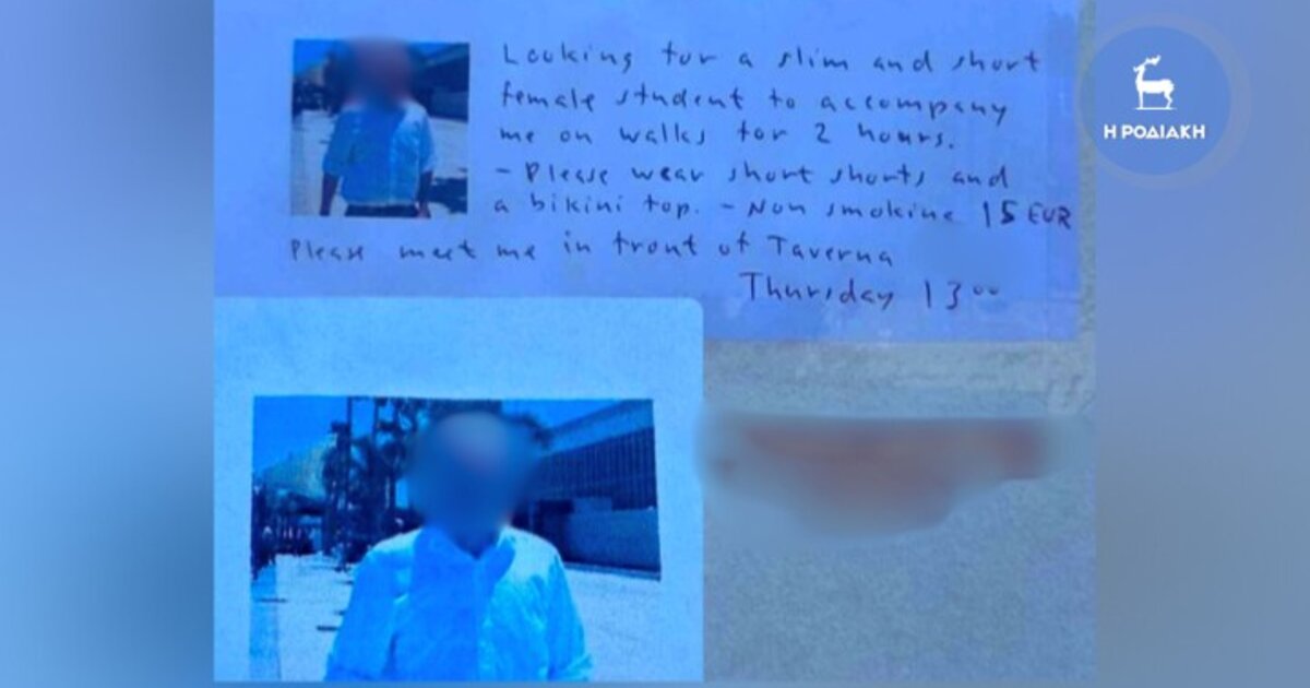 Ο 53χρονος εφέρετο να έχει προβεί σε ανάρτηση αγγελίας σε πίνακα ανακοινώσεων του 1ου Γυμνασίου Ρόδου σύμφωνα στην οποία ανέγραφε «αναζητώ αδύνατη και κοντή μαθήτρια για να μου κάνει συντροφιά σε περιπάτους για 2 ώρες. Παρακαλώ να φοράς κοντό σορτσάκι και από πάνω ένα μπικίνι. Να μην καπνίζεις. 15 ευρώ. Παρακαλώ συνάντησε με έξω από την ταβέρνα «Στενό». Πέμπτη 13:00».