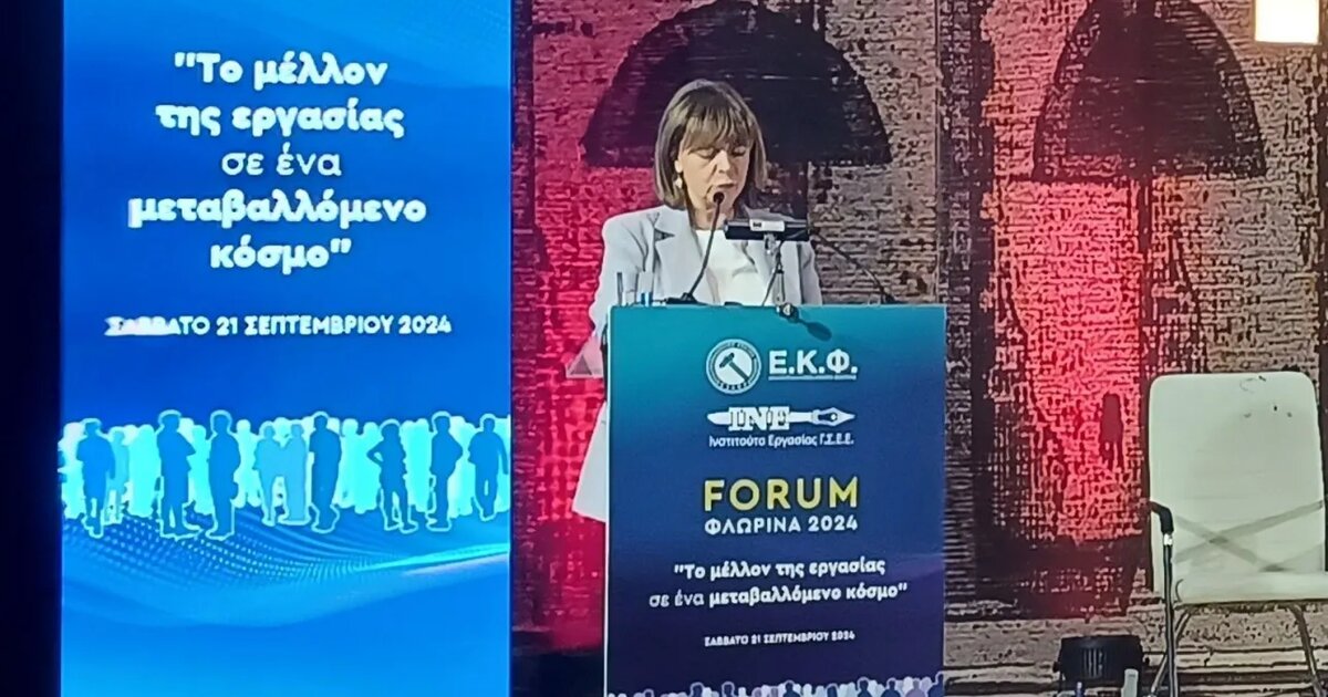 «Η μετάβαση στον νέο κόσμο της εργασίας δεν μπορεί να είναι επιτυχής αν δεν συνοδεύεται από αποτελεσματική προστασία έναντι των κινδύνων, από διάλογο με τους κοινωνικούς εταίρους και στενή διαβούλευση με την τοπική κοινωνία», τόνισε η Πρόεδρος της Δημοκρατίας Κατερίνα Σακελλαροπούλου, κατά τον σύντομο χαιρετισμό της στο συνέδριο «Το μέλλον της εργασίας σε έναν μεταβαλλόμενο κόσμο», που συνδιοργανώνουν το Εργατοϋπαλληλικό Κέντρο Φλώρινας και η Γενική Συνομοσπονδία Εργατών Ελλάδος, στη Φλώρινα.