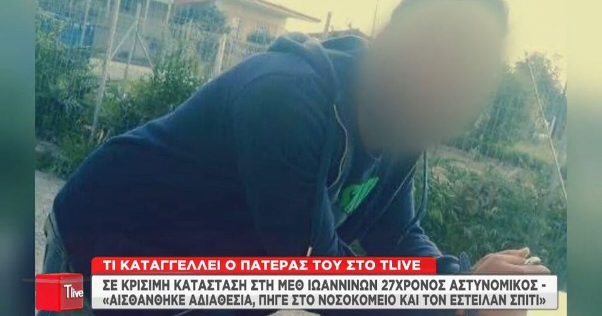 Σε κρίσιμη κατάσταση στη ΜΕΘ Ιωαννίνων 27χρονος αστυνομικός. Τι καταγγέλλει ο πατέρας του για το νοσοκομείο, το οποίο επισκέφτηκε και τον έστειλαν σπίτι.